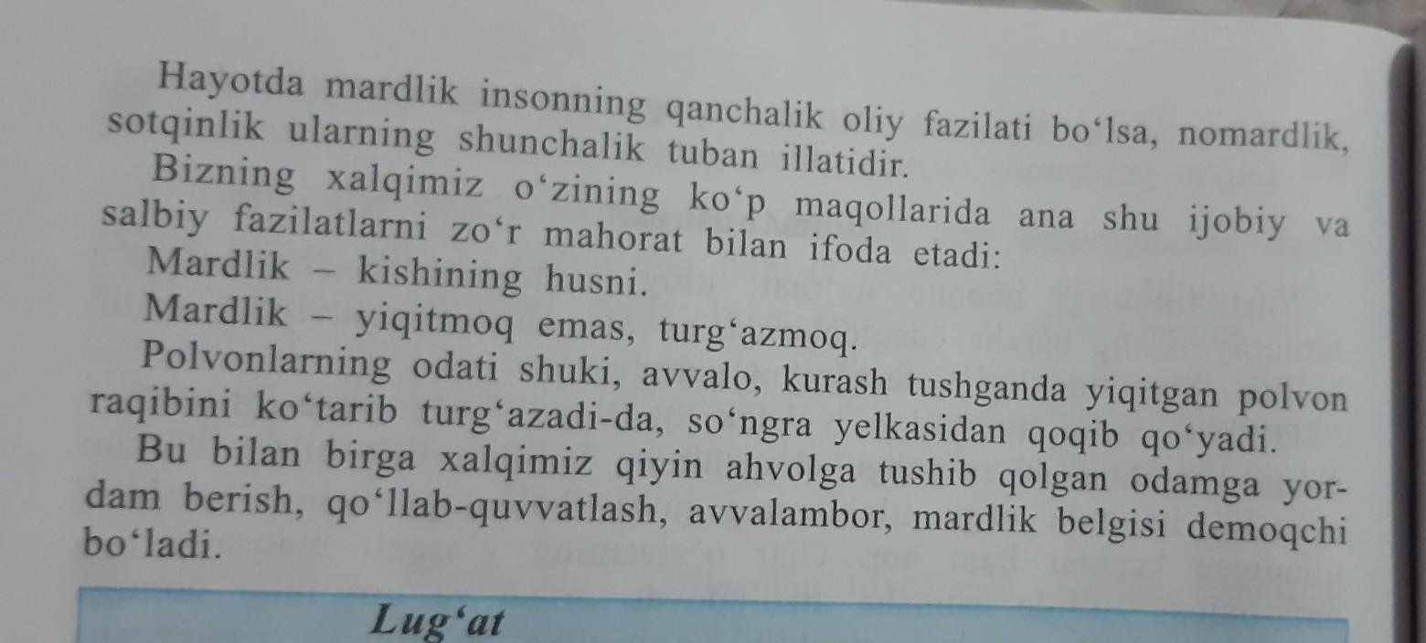 Чем выше качество человека в жизни, тем выше мужество Булия, безразличие,сатинство, чем они являются, тем выше их состояние. Наш народ во многих своих статьях с большим мастерством выражает эти положительные и отрицательные качества: мужество-Хосни человека. Мужество-это не крахмал, а круче. Обычай полванов состоит в том, что во-первых, полвон, который падает, когда борьба падает, поднимает своего противника, а затем стучит по плечу. наряду с этим наш народ будет иметь в виду, прежде всего, знак мужества - дать человеку, попавшему в трудную ситуацию, отдохнуть, поддержать.