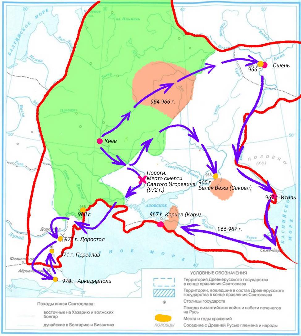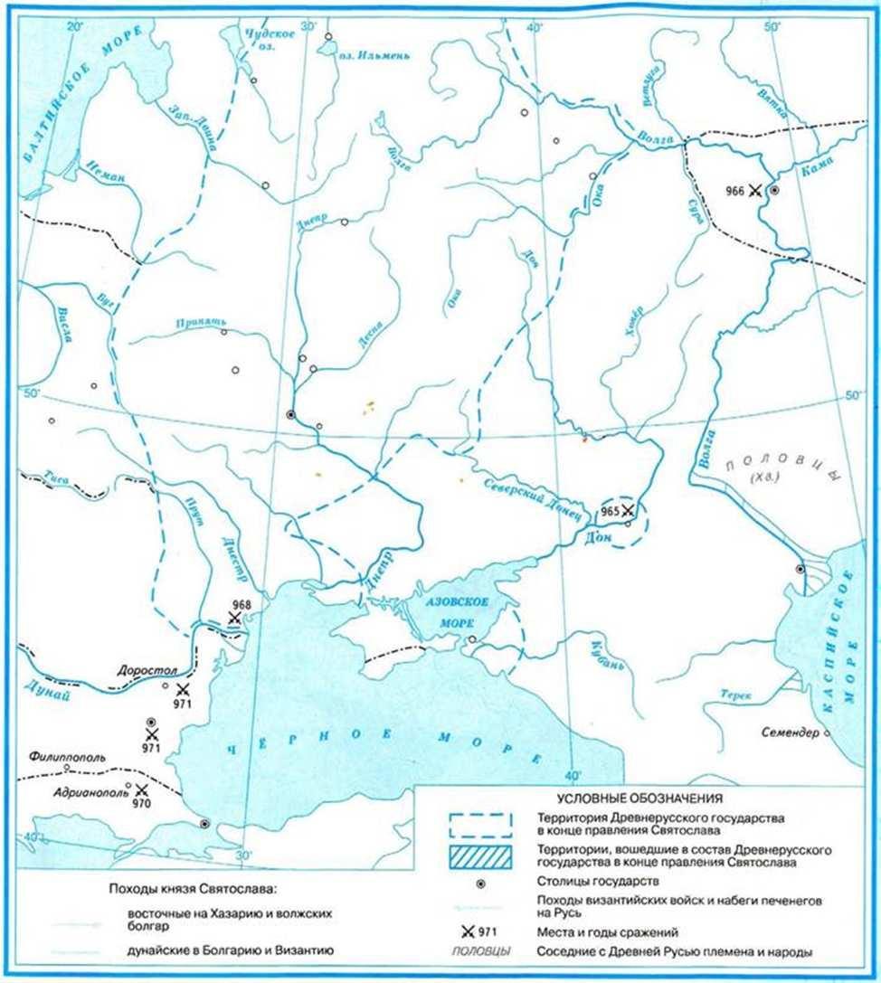 Б. Святослав Игоревич почти всю свою жизнь провел в походах. Покажите на карте направления его походов. Обозначьте места и подпишите годы важнейших сражений, произошедших в период правления Святослава Игоревича.