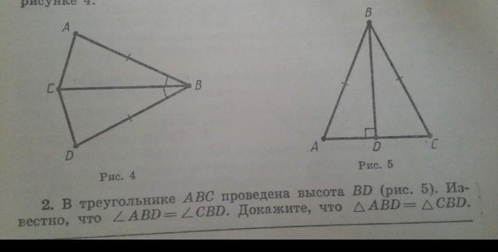 так как AB=BC, угол(ABD) = углу(CBD), угол(BDA) прямой, равен углу(BDC), то такие треугольники равны по 2-му признаку