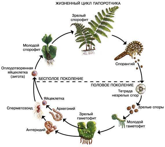 Жизненный цикл папоротника включает смену бесполого и полового поколений - спорофита и гаметофита. Спорофит - всем известное зеленое растение - образует спорангии, часто выглядящие как красновато-бурые бугорки на нижней стороне обычных листьев или на специализированных листьях (спорофиллах) . Спорангии рассеивают тысячи спор, каждая из которых в благоприятных условиях прорастает в тонкую зеленую пластинку диаметром обычно ок. 6 мм. Это гаметофит, называемый заростком и обычно нами не замечаемый. На нем развиваются мужские и женские половые органы - антеридии и архегонии. Когда они созревают, сперматозоиды из антеридиев плывут по покрывающей заросток пленке воды в архегонии и оплодотворяют здесь яйцеклетки. Из зиготы образуется новый спорофит, и жизненный цикл завершается.