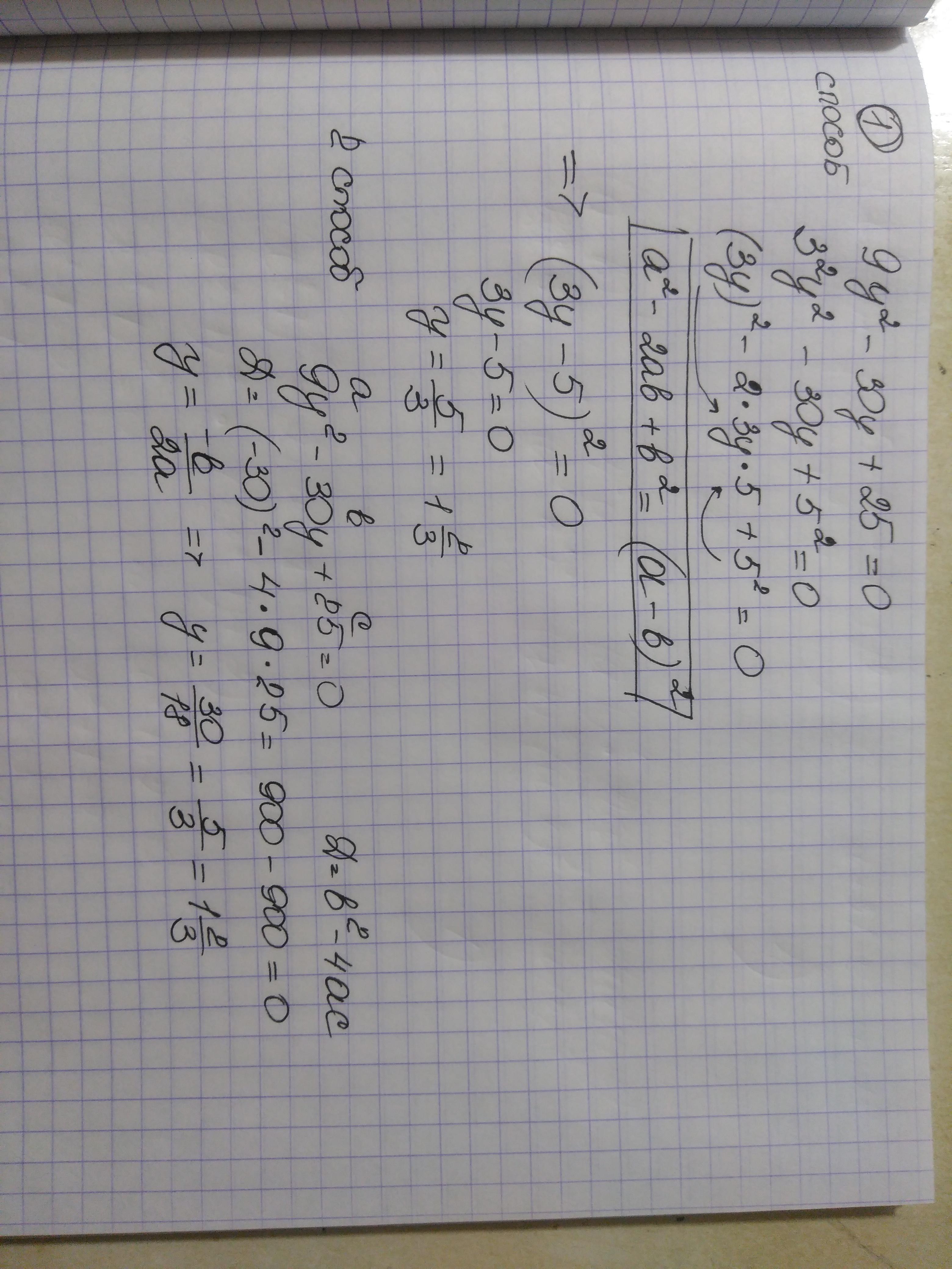 9y^2-30y+25=0. 1) распишите на листочке решение 2) цифры и напишите где а б и с .3) напишите какой формулой вы пользовались) потому что здесь походу оди Корень) и напишите почему там идет 4*9*5=900-900