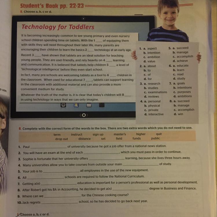 1 - drop out (of university - отчислиться из университета), 2 - term (семестр), 3 - distance (learning - дистанционное обучение), 4 - field (of study - профильное обучение), 5 - instruct (инструктировать), 6 - public (общественный^), 7 - higher (education - высшее образование), 8 - master's (degree - степень магистра), 9 - sign up (for - записаться куда-то), 10 - quitting^^ (что ушёл).