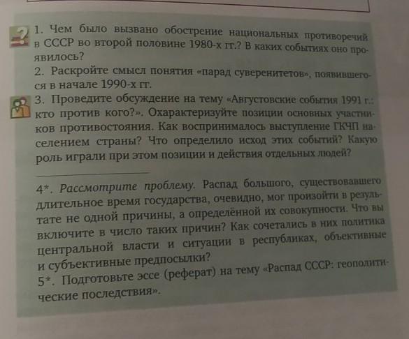 1. Обострение национальных противоречий в СССР во второй половине восьмидесятых было вызвано рядом причин. Самая главная из них - Российская империя состояла из множества губерний и уездов, которые до того являлись историческими землями тех или иных народов, вошедших в состав империи добровольно или же завоеванных. При делении территории СССР на республики (15 республик) границы между республиками составлялись без учета их исторических границ и проживавших там народов. Зачастую решения принимались исходя из интересов революции и ее распространения на тот или иной регион, игнорируя историю региона. Таким образом на территории СССР возникло множество нерешенных территориальных вопросов между республиками, впоследствии переросших в затяжные конфликты. Примеры: осетино-абхазо-грузинский конфликт (Юг Осетии, Абхазия), армяно-азербайджанский конфликт (Карабах (Арцах)), русско-молдавский конфликт в Приднестровье.