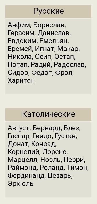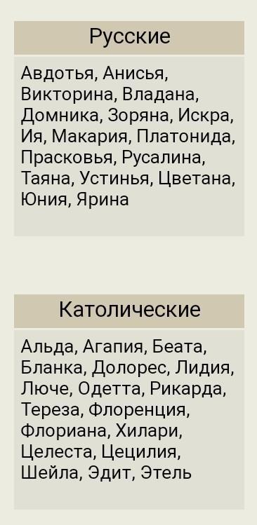 Авдотья, Анисья, Викторина, Владана, Домника, Зоряна, Искра, Ия, Макария, Платонида, Прасковья