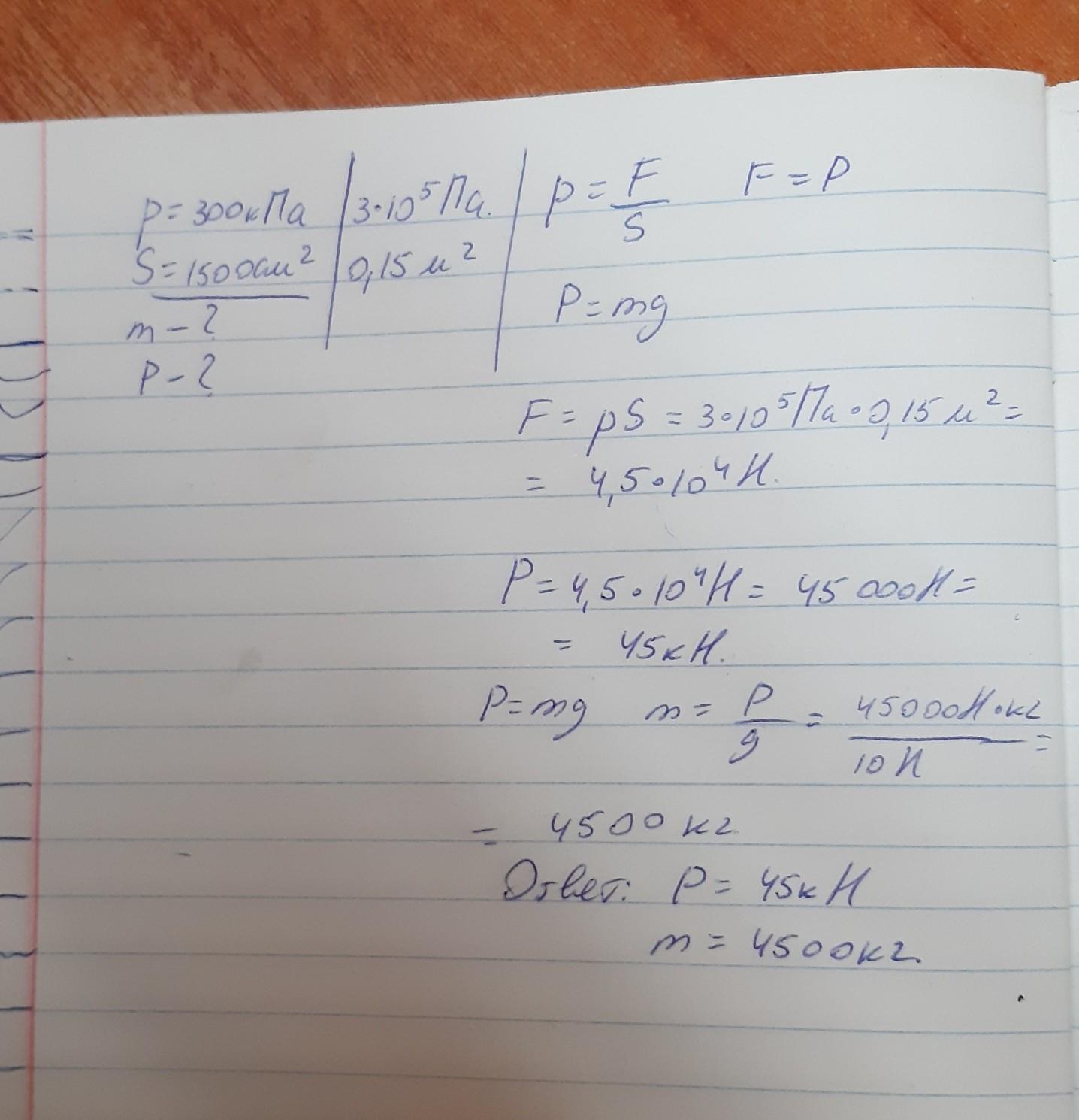 Каток работающий на укладке асфальта,производит давление 300 кПа. Определите вес и массу катка, если площадь его опоры 1500см². Виде задачи напишите пжжжж СРОЧНО ВИДЕ ЗАДАЧИ