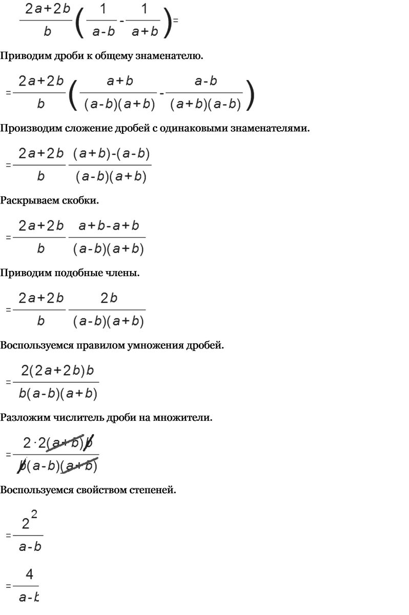сначала действие в скобках.приводим к общему знаменателю.общий знаменатель (а-в)(а+в).Получается: при сокращении 2(а+в)все делить на знаменатель (а-в)(а+в).потом второе девйствие ,нужно перемножить дроби.2а+2в делить на знаменатель в умножить на дроби в числителе выносим двойку за скобки 2(а+в)и делим на знаменатель (а-в)(а+в) .сокращаем на в и (а+в) в итоге:2в делить на а-в