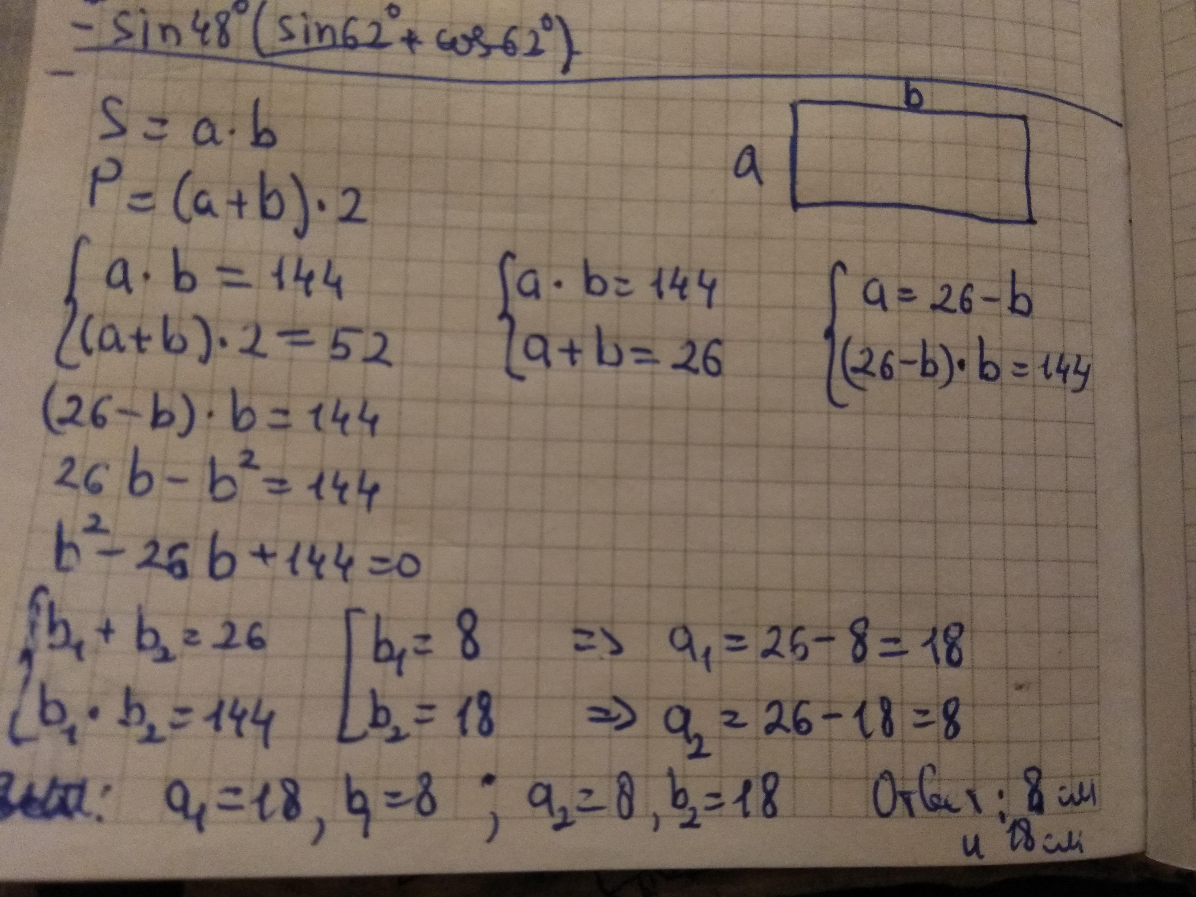 Площадь прямоугольника равна 144 см^2, а его периметр равен 52 см. Найди стороны прямоугольника.