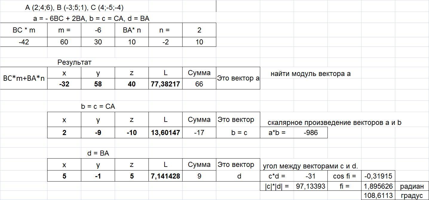Помогите решить! 30 баллов! По координатам точек A, B и C для указанных векторов найти модуль вектора а, скалярное произведение векторов а и b, угол между векторами c и d.