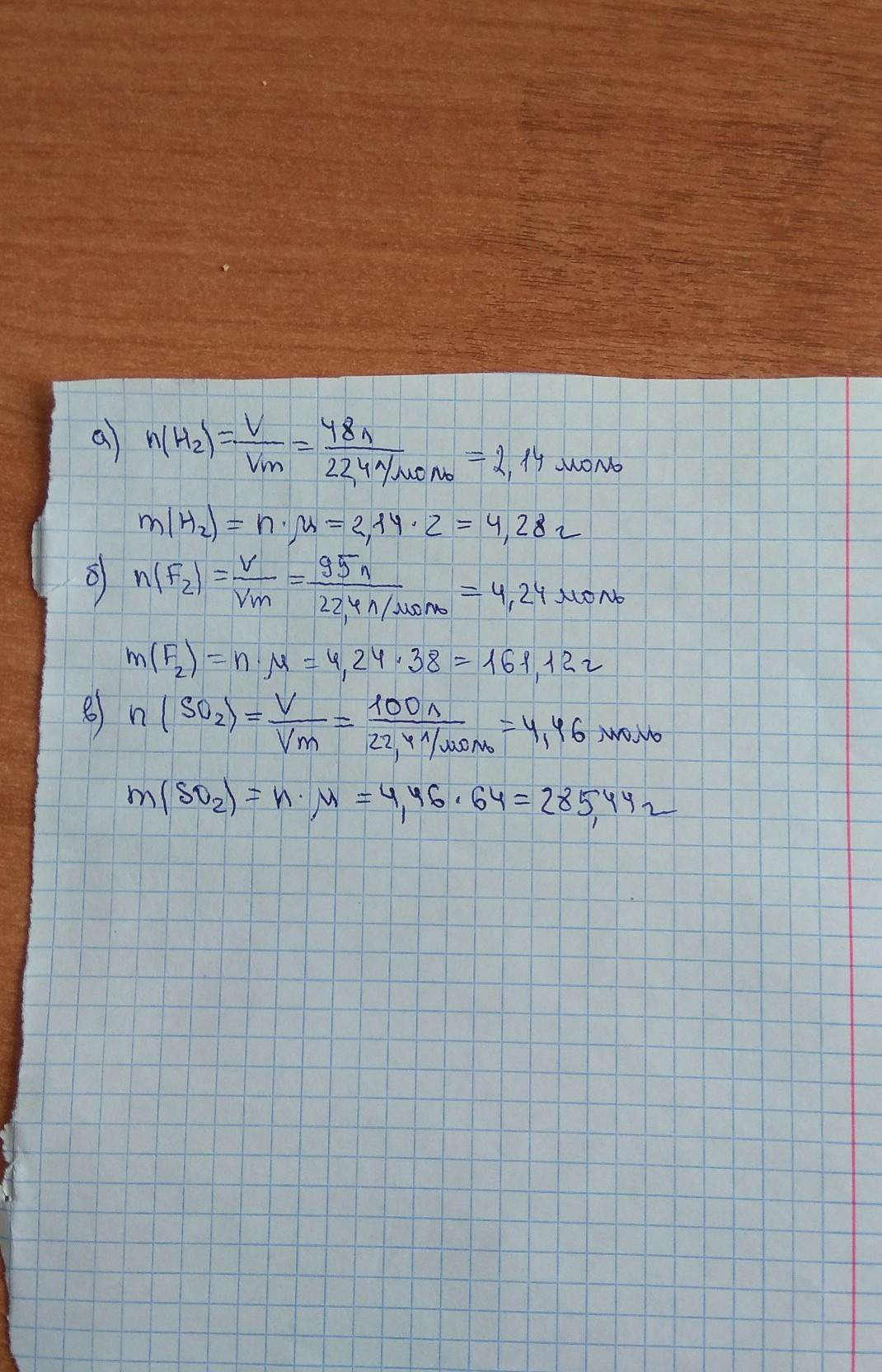 Вычислите, какую массу имеют газы указанных объемов : а) 48 л водорода, б) 95 л фтора, в) 100 л сульфур(IV) оксида