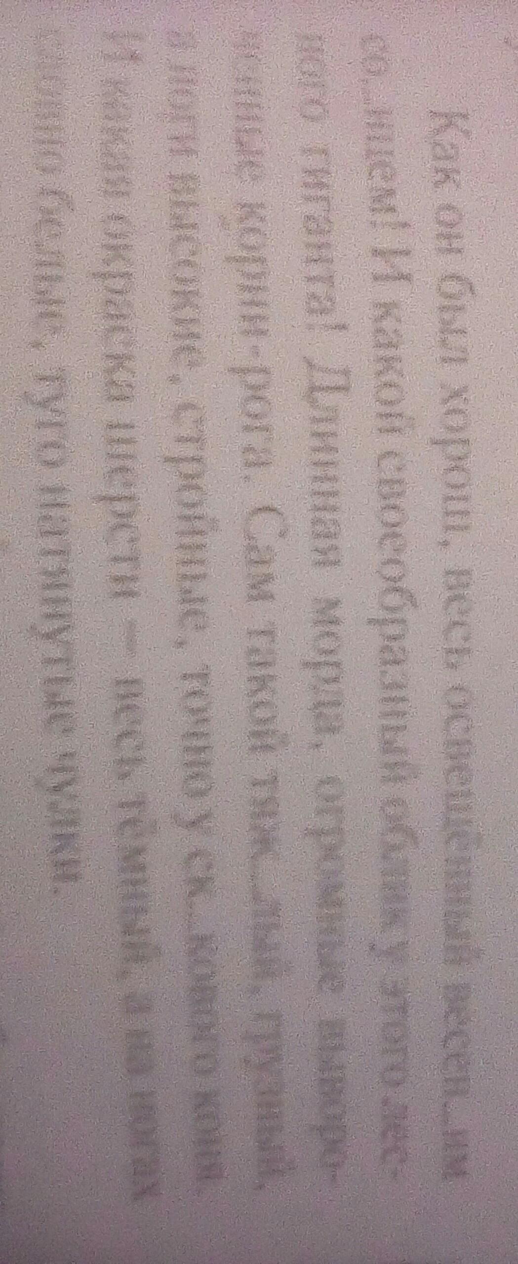 Как он был хорош, весь освещённый весенним(НН, т.к. прилагательное образовано от существительного с основой на -н: весна -> весенний) солнцем(солнечный)! И какой своеобразный облик у этого лесного гиганта! Длинная морда, огромные вывороченные корни-рога. Сам такой тяжёлый(тяжесть), грузный, а ноги высокие, стройные, точно у скакового(чередование скак//скок//скач//скоч; а пишется перед к) коня. И какая окраска шерсти — весь тёмный, а на ногах словно белые, туго натянутые чулки.