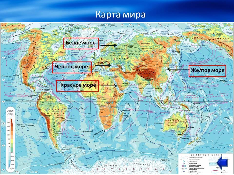 Ответ: Чёрное, Жёлтое, Белое и Красное моря носят название цвета. (см на карте месторасположение)