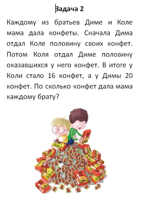 Каждому из братьев Диме и Коле мама дала конфеты. Сначала Дима отдал Коле половину своих конфет. Потом Коля отдал Диме половину оказавшихся у него конфет. В итоге у Коли стало 16 конфет, а у Димы 20 конфет. По сколько конфет дала мама каждому брату?