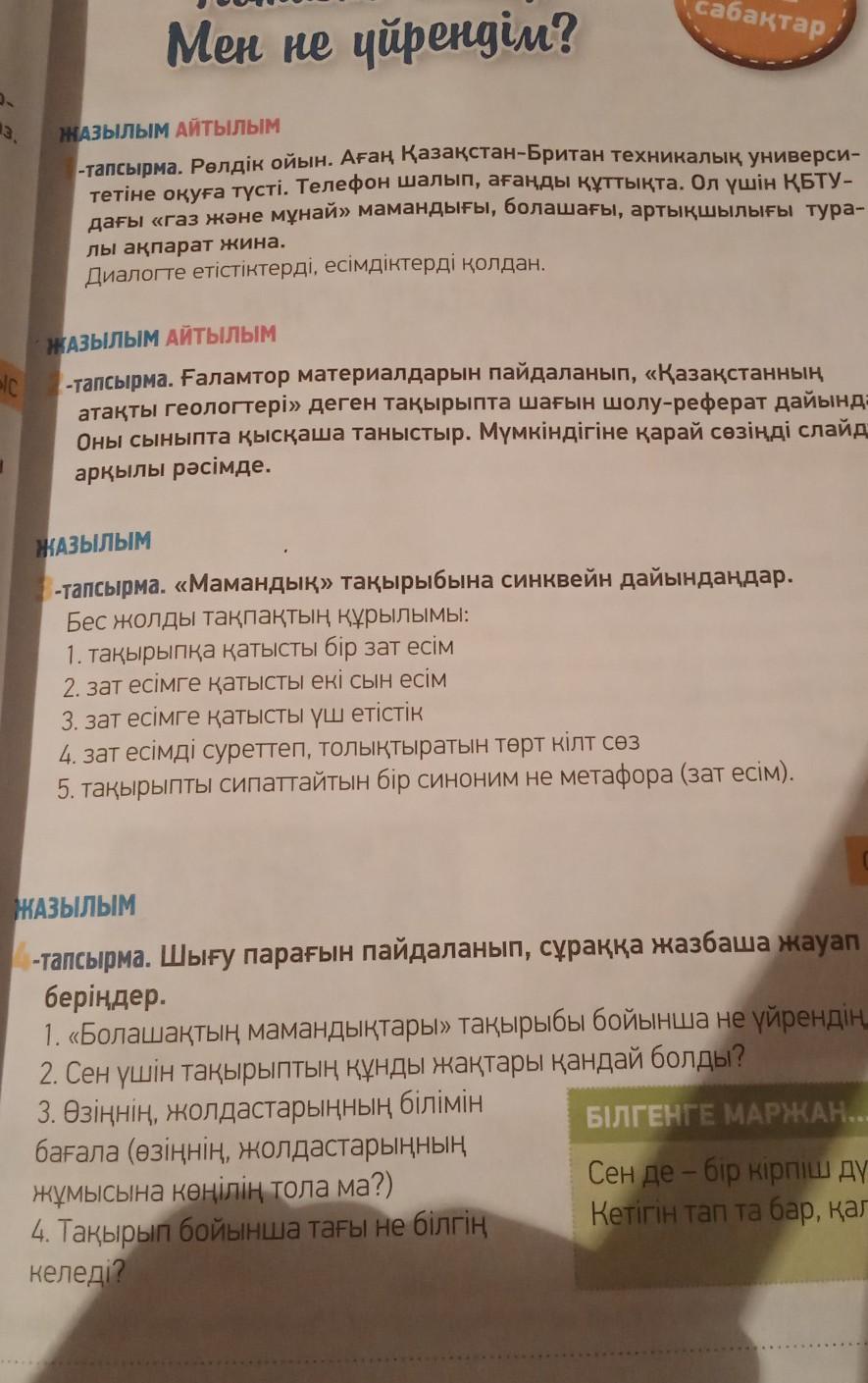 1.мамандық 2.жақсы,керемет 3.жасайды,орындайды,бұйырады. 4.Кез-келген мамандық өздігімен қызық.5 жұмыс