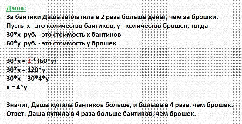 Маша купила 3 бантика и 2 брошки, заплатив всего 210 рублей. При этом за бантики она заплатила на 30 рублей меньше, чем за брошки. Даша тоже купила бантики и брошки, но за бантики она заплатила в 2 раза больше денег, чем за брошки. Чего больше купила Даша бантиков или брошек и во сколько раз?