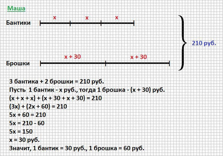 Маша купила 3 бантика и 2 брошки, заплатив всего 210 рублей. При этом за бантики она заплатила на 30 рублей меньше за больше денег, чем за брошки. Чего больше купила Даша бантиков или брошек и во сколько раз?