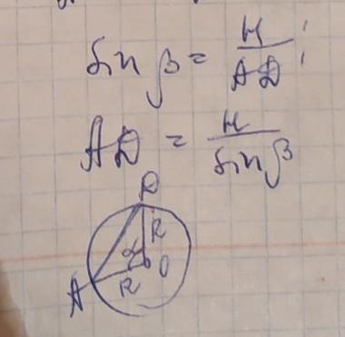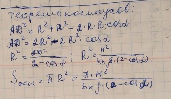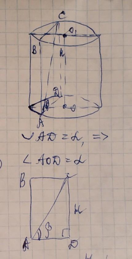 парлельно оси цилиндра проведено плоскость, отсекает от окружности основания дугу, градусная мера которого составляет L (альфа). Диагональ сечения наклонена под углом В (бета) до основания цилиндра. Найдите площадь основания, если высота цилиндра равна Н.