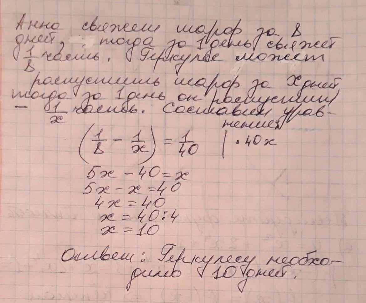Крёстная Анна вяжет длинный шарф. Она его может связать за 8 дн(-ей, -я), но кот Геркулес тайно распускает шарф с другой стороны, поэтому шарф удаётся связать только за 40 дней. Сколько дней необходимо Геркулесу, чтобы распустить готовый шарф?