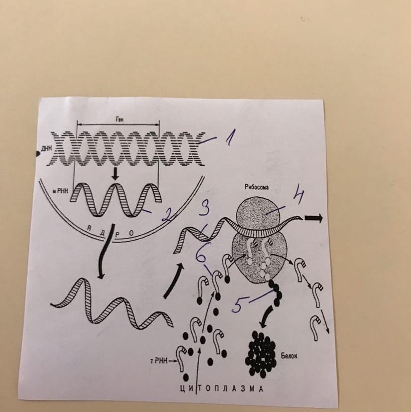 Ответ: на рис. изображён процесс биосинтеза белка. Под цифрой 1 изображена ДНК на которой идёт транскрипция, т.е синтез иРНК - 2. Этот процесс происходит в ядре. Далее РНК перемещается в цитоплазму и к ней присоединяется рибосома 4. Под цифрой 3 изображена иРНК, соединенная с рибосомой. Так же в рибосому направляются тРНК 6,несущие аминокислоты. В рибосоме при участии тРНК, иРНК и аминокислот начинается синтез белка 5,который называется трансляция.