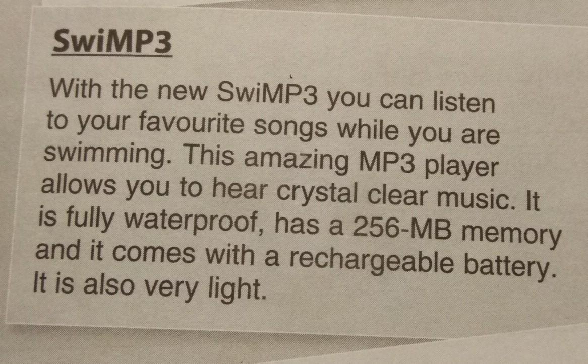Have you ever heard about SwiMP3? This is a fantastic device that lets a person listen to music using it underwater. They can enjoy its super perfect sound. The device has a sufficient amount of memory. Its battery is rechargeable. It is especially a good option for a walk or a swim because it weighs almost nothing.