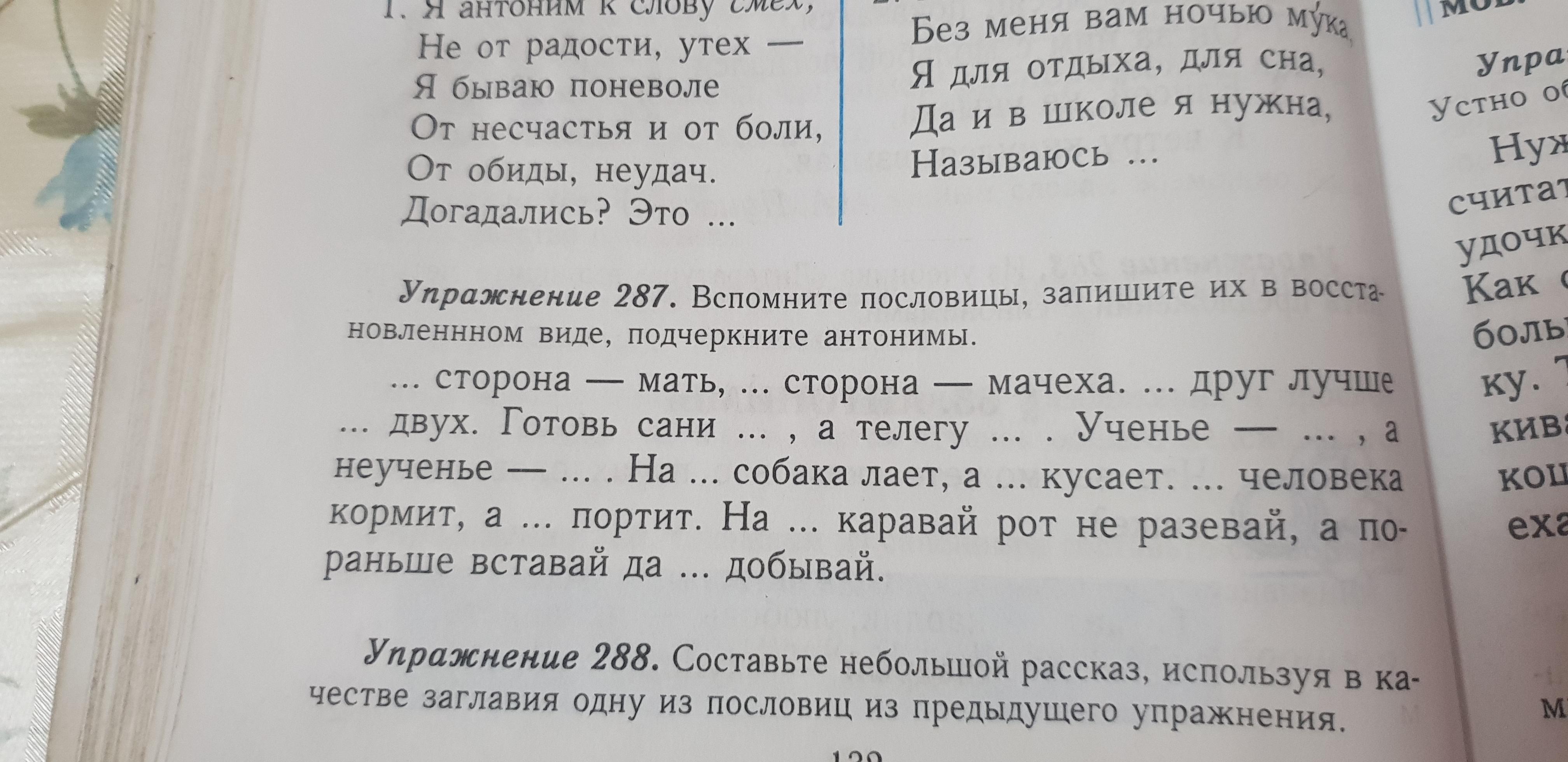 Родная сторона - мать, чужая сторона - мачеха. (Антонимы: Родная, чужая) Старый друг лучше новых двух. (Антонимы: Старый, новый) Готовь сани летом, а телегу зимой. (Антонимы: Летом, зимой) Ученье - свет, а неученье - тьма (Антонимы: Свет, тьма) На смелого собака лает, а трусливого кусает (Антонимы: Смелого, трусливого) Труд человека кормит, а лень портит (Антонимы: Труд, лень) На чужой каравай рот не разевай, а по раньше вставай да свой затевай. (Антонимы: Чужой, свой)