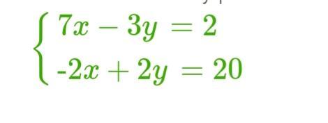 \begin{equation*} \begin{cases}7x-3y=2\\-2x+2y=20 \end{cases}\begin{cases}7x-3y=2\\x-y=-10\\ \end{cases}\begin{cases}7x-3y=2\\x=y-10\\ \end{cases}\end{equation*}