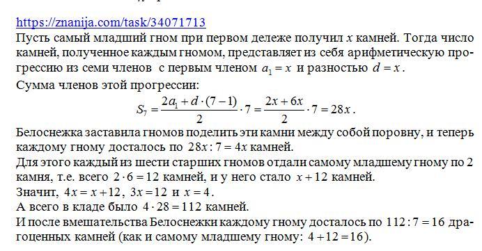 7 гномов нашли клад из драгоценных камней и поделили его между собой. Самому младшему досталось несколько камней. Более старший получил вдвое больше, чем самый младший. Третий по старшинству втрое больше, чем самый младший, четвертый - вчетверо и. т. д., а у самого старшего гнома в результате получилось в 7 раз больше камней, чем у самого младшего. Когда Белоснежка узнала об этом, она сказала гномам, что клад они поделили несправедливо, и теперь каждый из них должен отдать по 2 камня каждому из своих младших братьев, и только самый младший ничего никому отдавать не должен. В результате камней у гномов стало поровну. Сколько драгоценных камней нашли гномы?