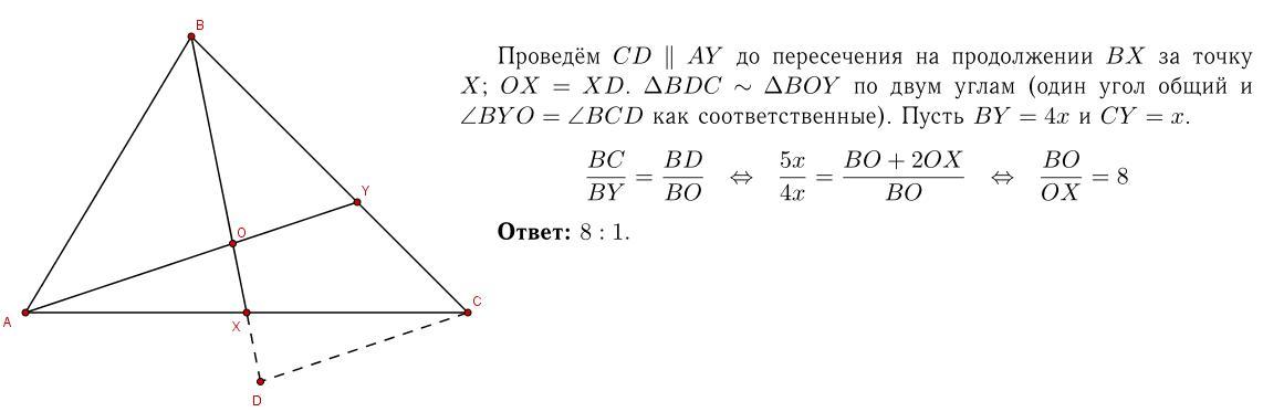 На сторонах AC і BC трикутника ABC позначено точки X і Y відповідно так, що AX=XC, BY/YC = 4/1. Відрізки AY і BX перетинаються в точці O. Знайдіть BO/OX