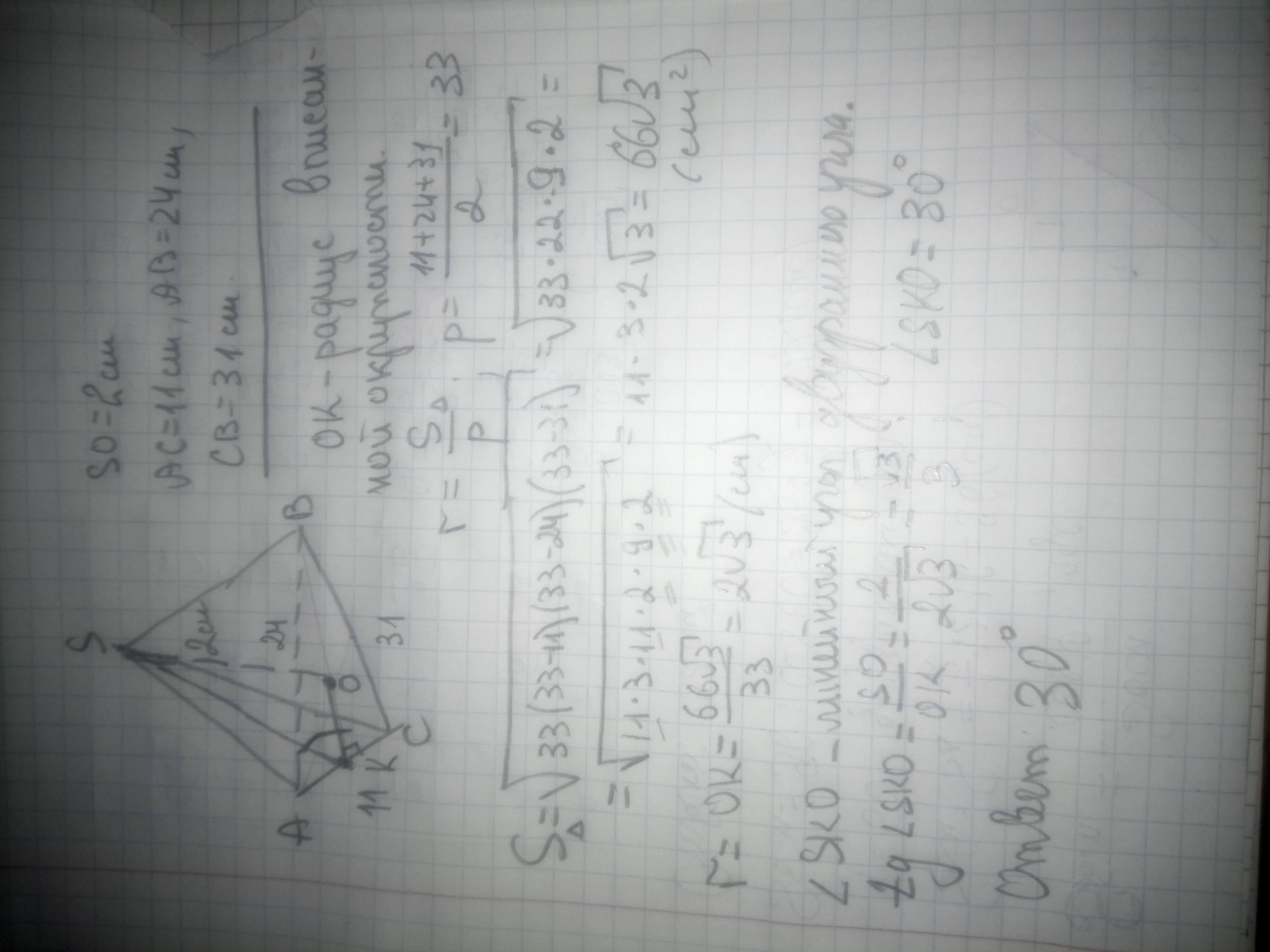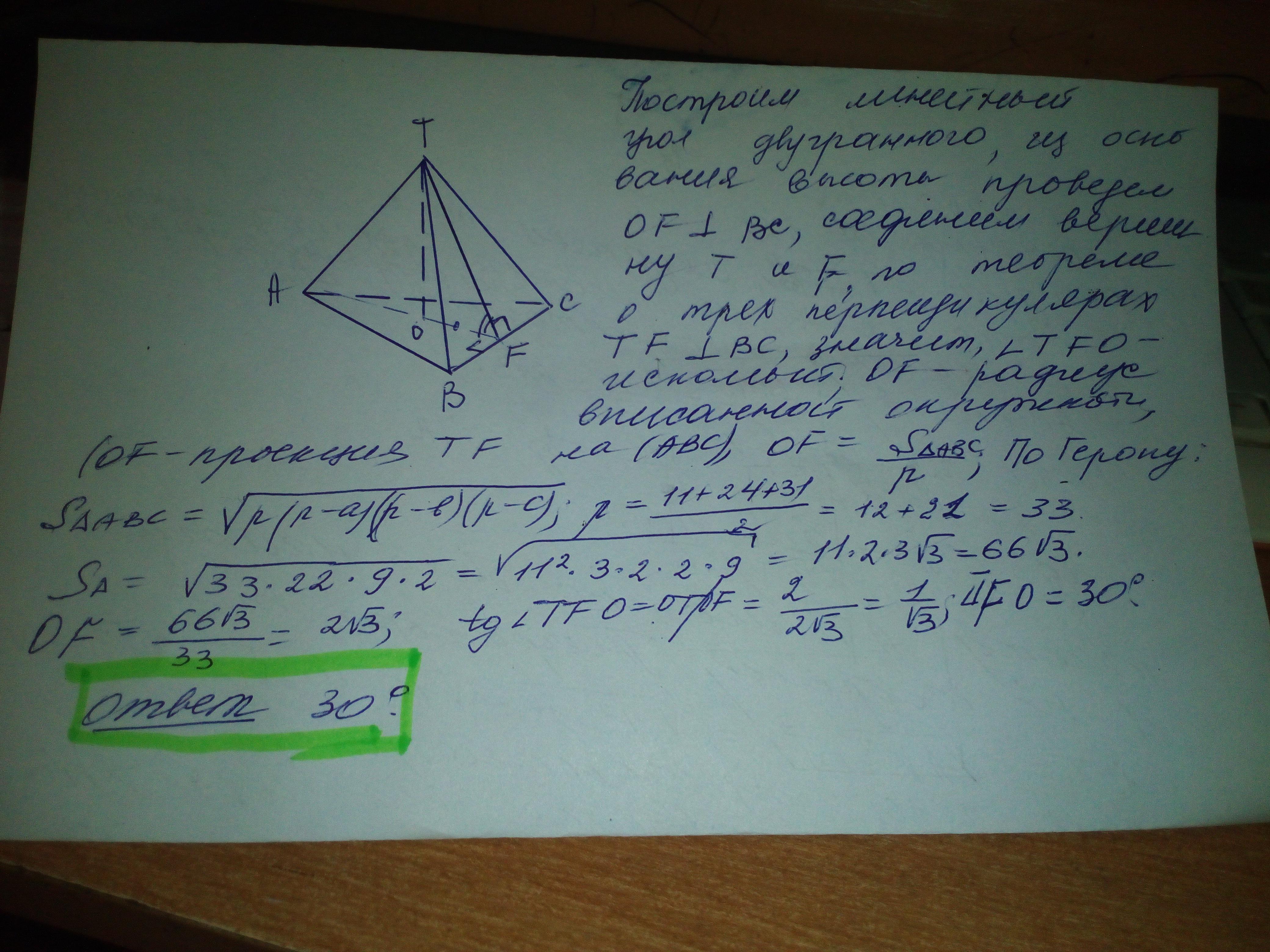 90 баллов! В основании пирамиды лежит треугольник со сторонами 11 см, 24 см и 31 см. Высота пирамиды равна 2 см. Все двугранные углы при ребрах основания равны. Найдите эти углы.