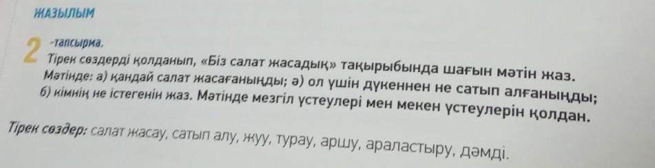 Биз бугин анамыз екеумиз салат жасаймыз деп жоспарладык. Ен биринши анам дукенге барып орамжапырак, сабиз, туз, майонез сатып алып келди. Содан сон анам уйге келди. Салат жасау ушин керекти заттар:орамжапырак, сабиз, туз, майонез, шунгыл ыдыс, пышак, тактай, касык керек. Ен биринши мен сабиздин сыртын жуып, кабыгын аршыдым. Ал анам орамжапыракты турады. Сосын ыдыска сабизди, орамжапыракты, майонезди, тузды салып араластырды. Уйдегилердин барине унады. Олар бизге дамди екен деп айтты