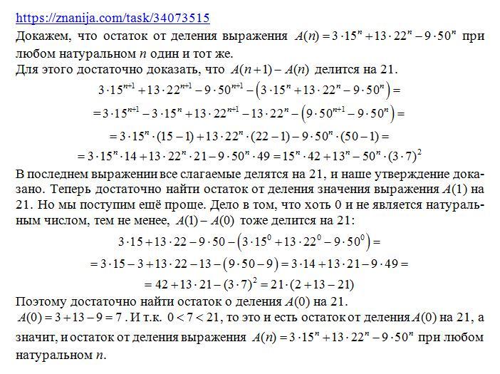 При любом натуральном n остаток от деления этого выражения на 21 равен 7.