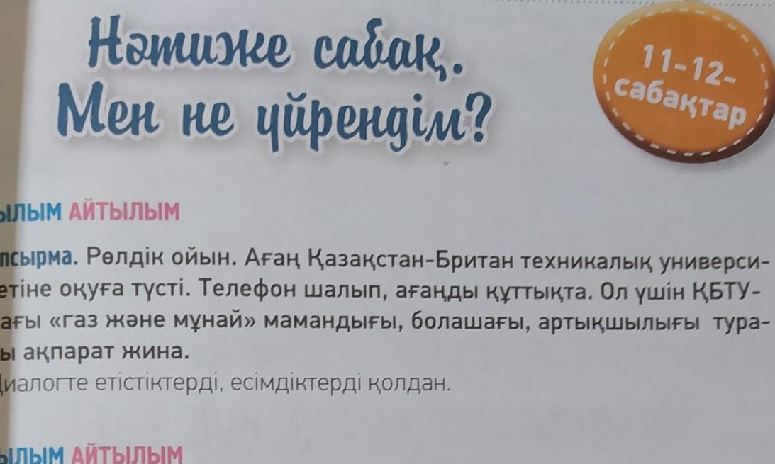 -Сәлем, ағашым! Қалың қалай?Менде бәрі жақсы!Айтпақшы, менің саған қоңырау шалған себебім, сені құттықтайын деп едім! Қазақстан-Британ техникалық университетіне оқуға түскенің құтты болсын! Негізі, болашақта газ және мұнай мамандығының маңызы зор деп ойлаймын.Мен де өскен кезде сіз секілді оқуға түскім келеді! Жарайды, аға, сау бол!