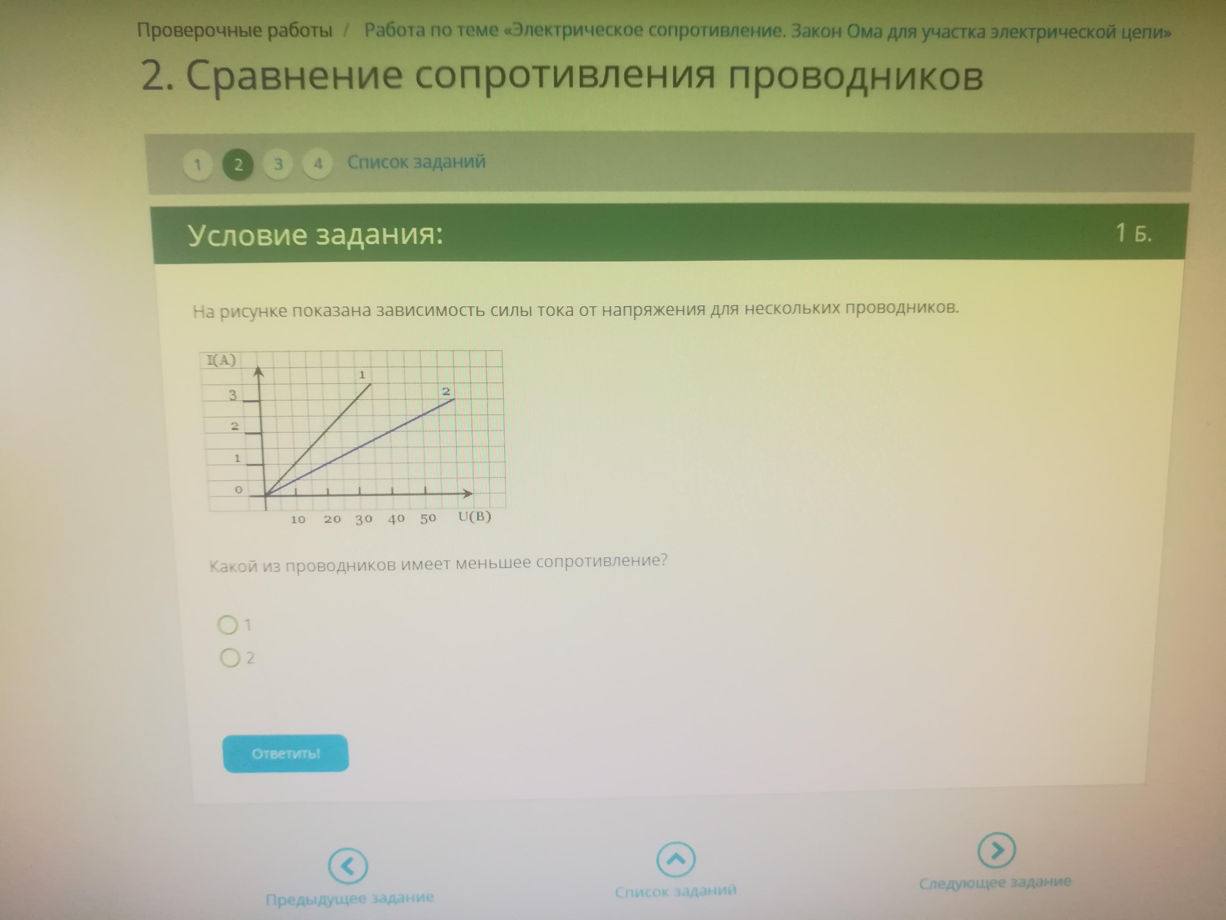 Объяснение: Из закона Ома R=U/I, следовательно, для напряжения 20В у первого проводника сила тока 2 А и сопротивление равно 10 Ом, а для второго проводника сила тока равна 1 А и сопротивление будет 20 Ом. Значит, у первого проводника сопротивление меньше.