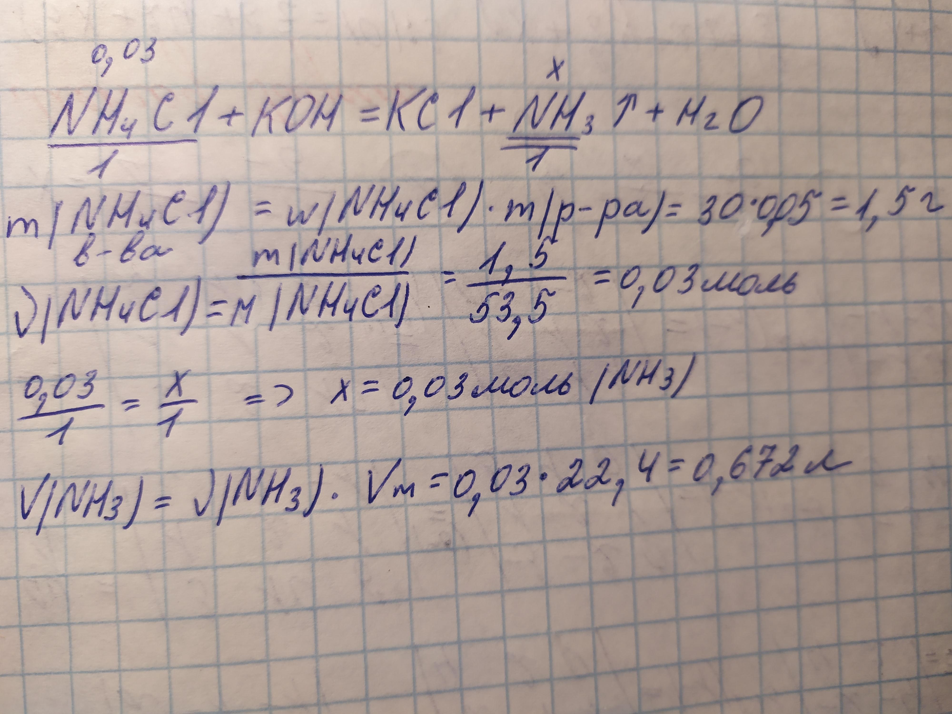 определите объем аммиака, который выделится при сливании 30 г 5% раствора хлорида аммония с гидроксидом калия