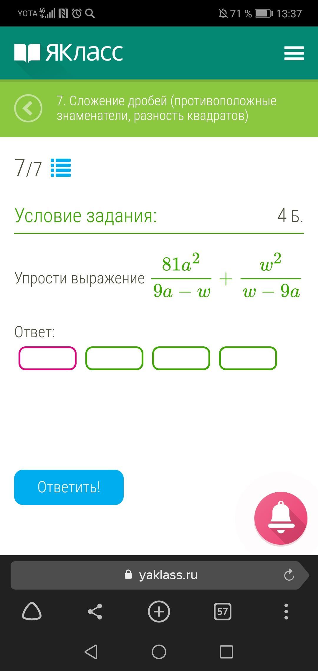 (81a²)/(9a-w) +w²/(w-9a)=(81a²)/(9a-w) -w²/(9a-w)=(81a²-w²)/(9a-w)=((9a-w)(9a+w))/(9a-w)=9a+w
