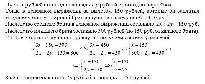 Из условия задачи легко понять, что 2 поросёнка стоят столько же, сколько и одна лошадь. Наследство можно было поделить, например, так: старшему и среднему брату достаются по 2 лошади, а младшему - лошадь и 2 поросёнка, что тоже было бы справедливо. Возможно, так оно и было. Но потом младший брат решил продать старшему одну лошадь за 150 рублей, а среднему - за те же 150 рублей продал двух поросят.