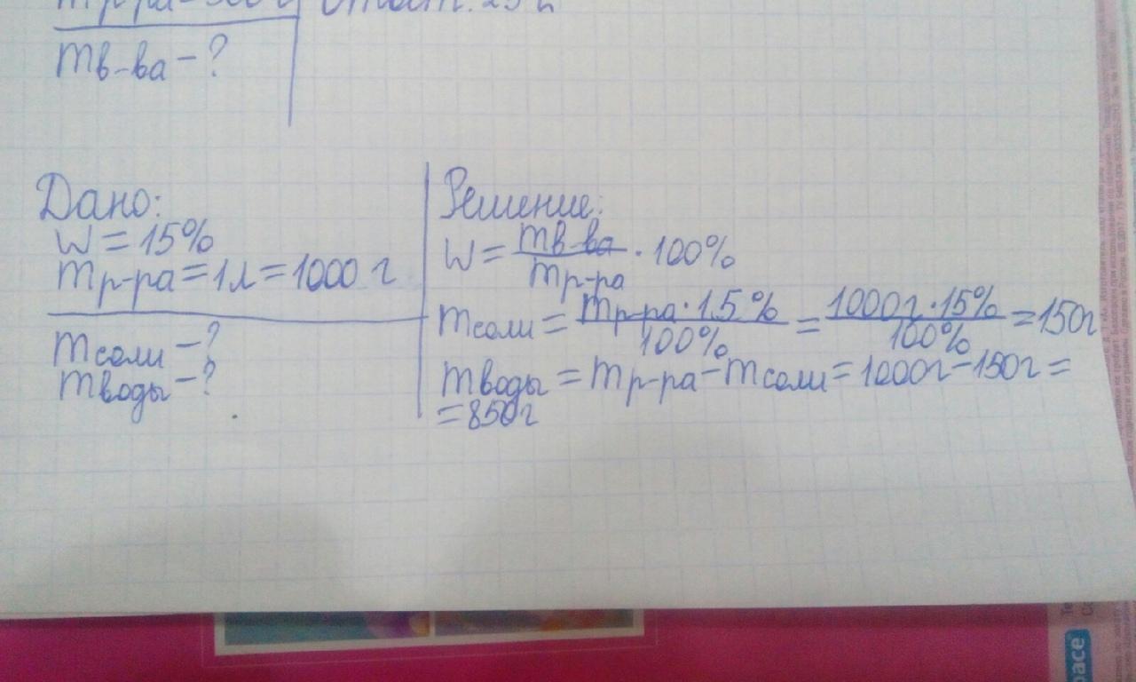 Сколько граммов соли и воды нужно взять для приготовления 1л рассола с массовой долей 15%?