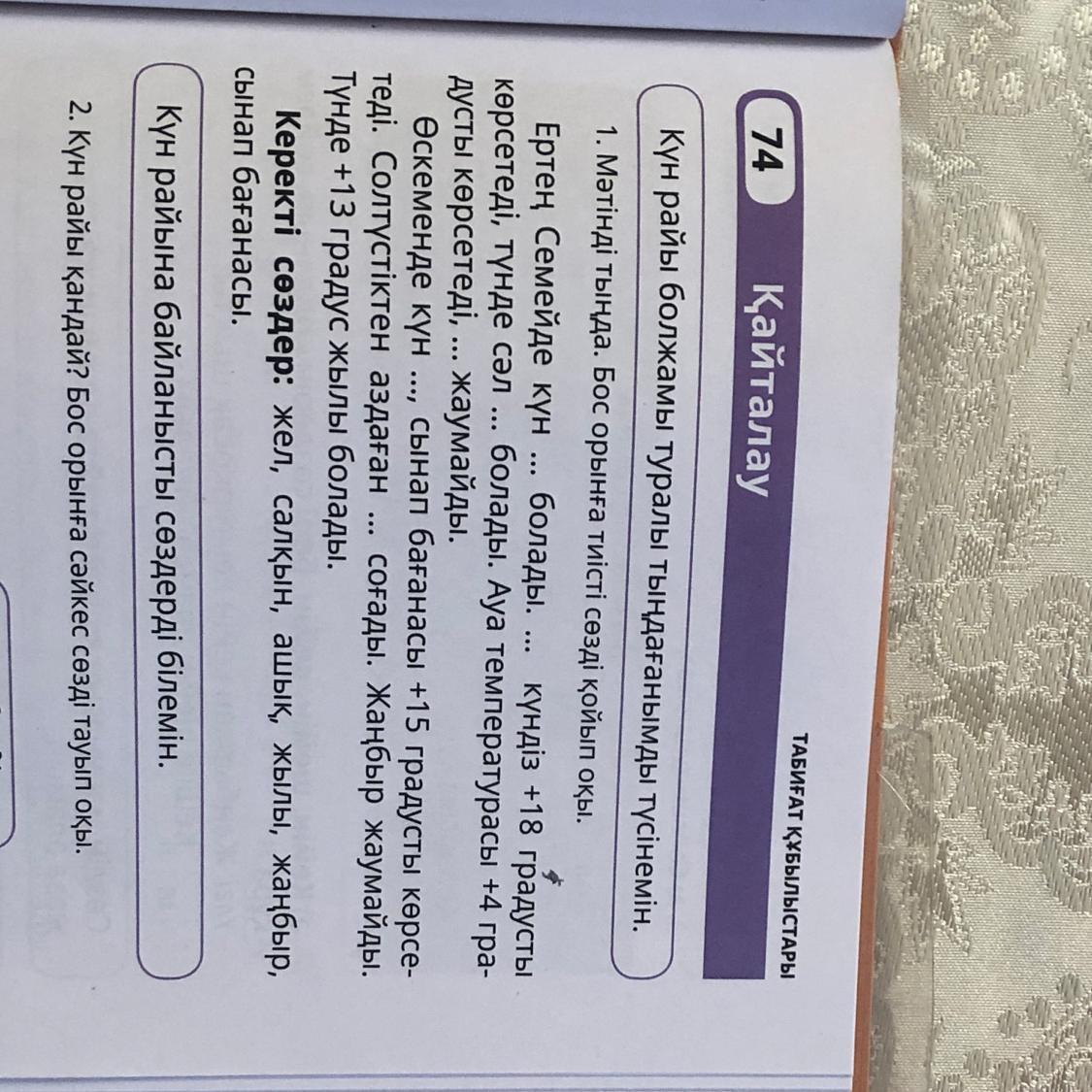 Ответ: 1. жылы 2. сынап бағанасы 3. салқын 4. жаңьыр 5. ашық 6. жел
