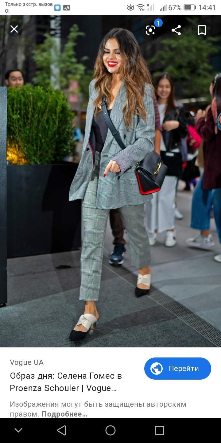 На ней одет модный костюм в клетку, состоящий из брюк и кардигана. Ещё у неё есть модный чёрный клатч, Из обуви на Селене Гомес одеты черные туфли на каблуке.