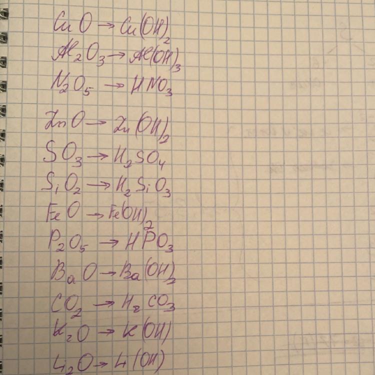 запишите формулы гидроксидов , соответствующих следующим оксидам : CuO, Al2O5, N2O5, ZnO, SO3, SiO2, FeO, P2O5, BaO, CO2, K2O, Li2O