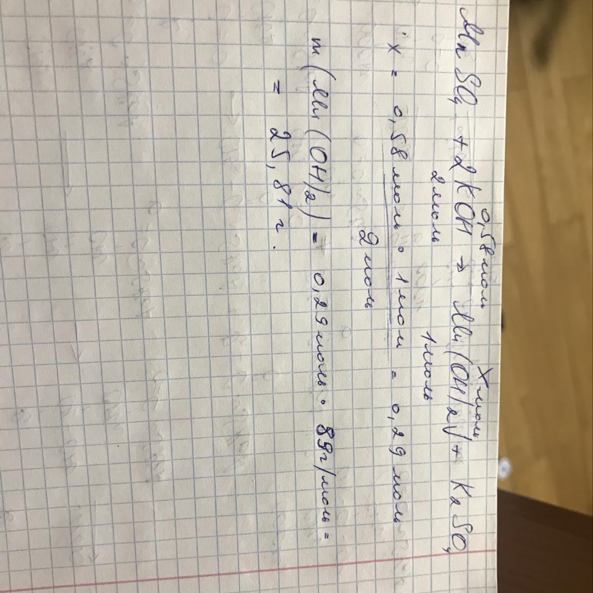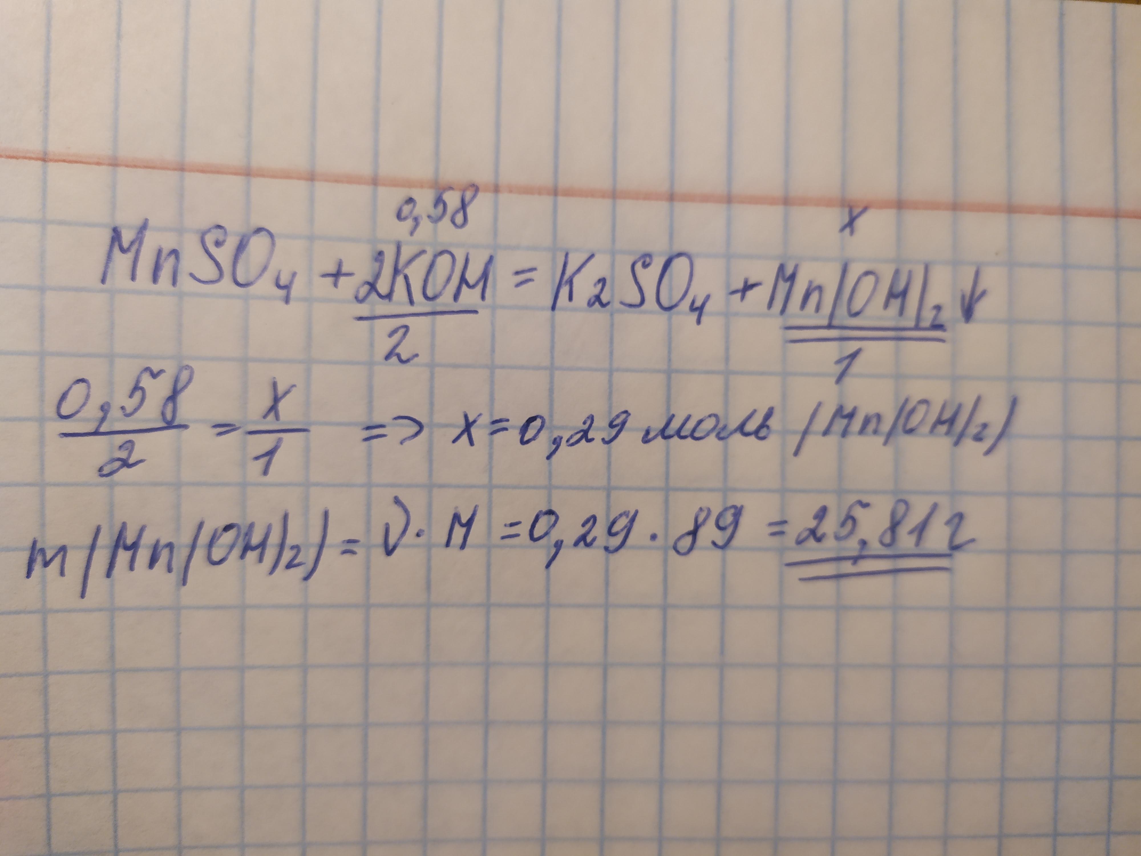 Вычисли, какая масса гидроксида марганца(II) выпадет в осадок при взаимодействии раствора сульфата марганца(II) с раствором, содержащим 0,58 моль гидроксида калия.