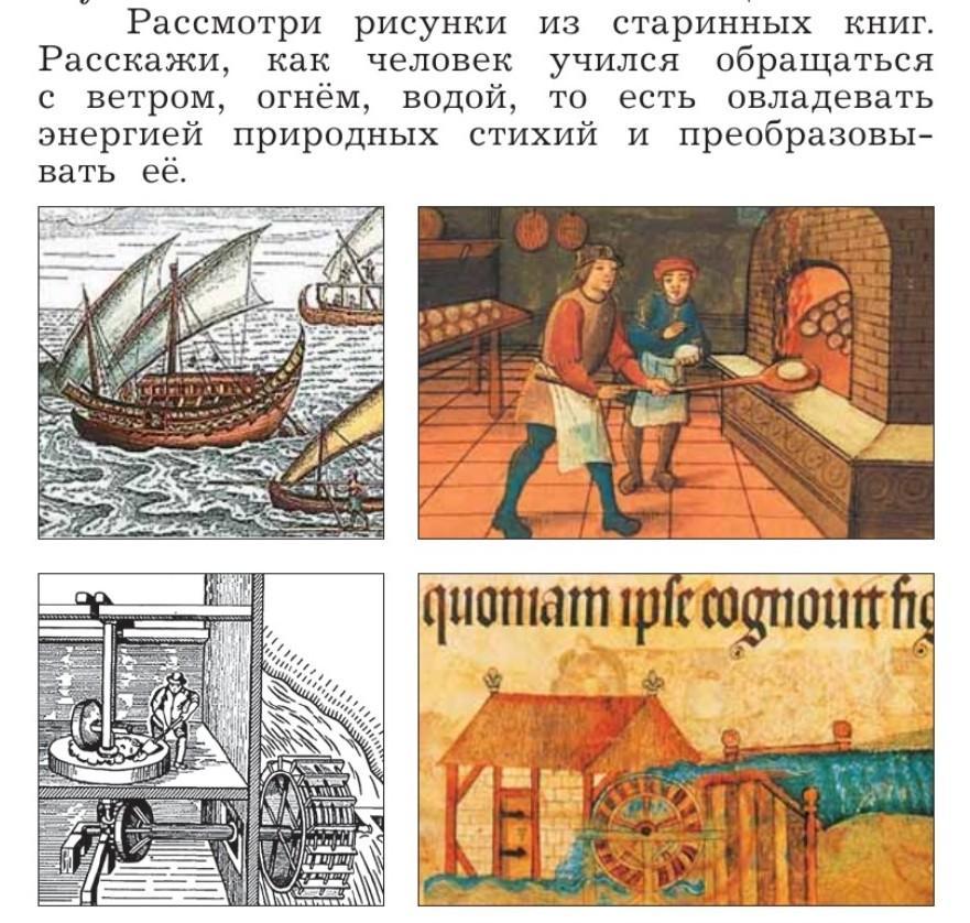 рассмотрите рисунки из старинных книг, расскажите как человек учился обращаться с огнём, ветром, водой