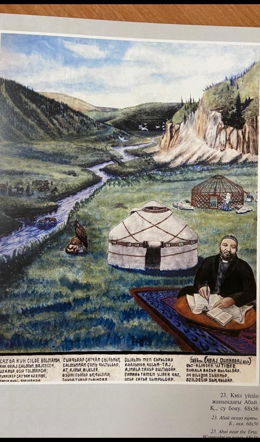 бұл суретте мен жазық даланы көріп тұрмын. Көк шөп, таза өзен, ұзын таулар, даладағы жануарлар, адамдар тұратын - киіз үйлер. Жерде отырған кісі, осы жерді қарап, бұл пейзаждың түрін қағазға сипаттап отыр.