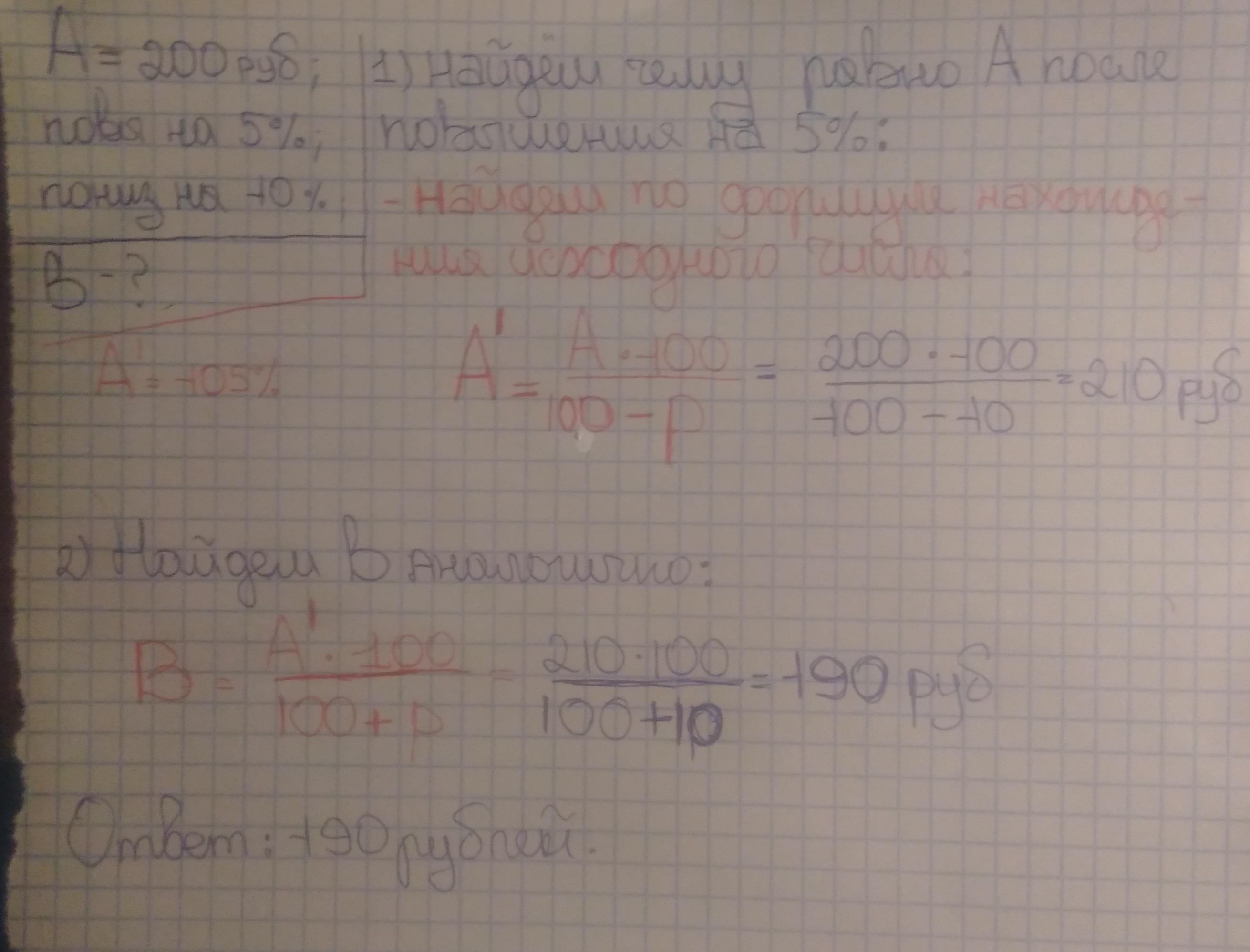 цена товара 200 руб сначала повысили на 5%. а затем понизили на 10% какой стала цена после двух изменений