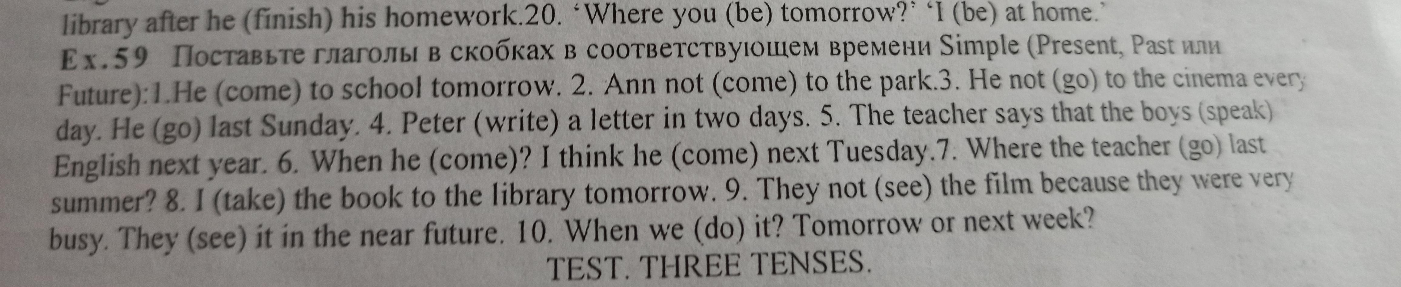 1.He will come to school tomorrow;2.Ann did not come to the park;3.He does not go to the cinema every day.He went last Sunday;4.Peter will write a letter in two days;5.The teacher says that the boys will speak English next year;6.When he came? I think he will come next Tuesday;7.Where the teacher went last summer?;8.I will take the book to the library tomorrow;9.They did not see the film because they were very busy.They will see it in near future;10.When we will do it? Tomorrow or next week?