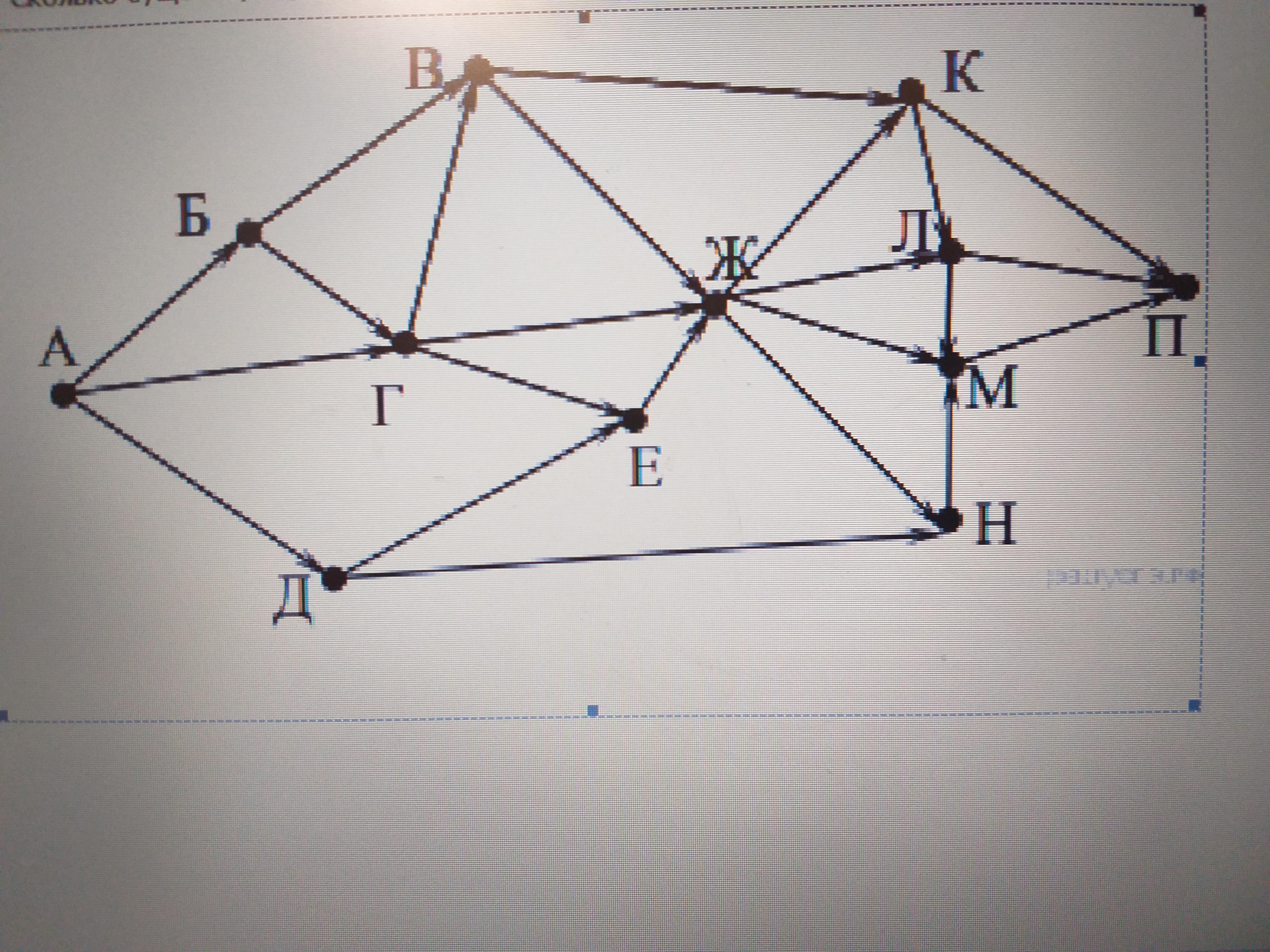 На рисунке схема дорог, связывающих города А,Б,В,Г,Д,Е,Ж,К,Л,М,Н,П. По какой дороге можно двигаться только в одном направлении,указанном стрелкой .Сколько существует различных путей из города А в город П,проходящих через город Л?