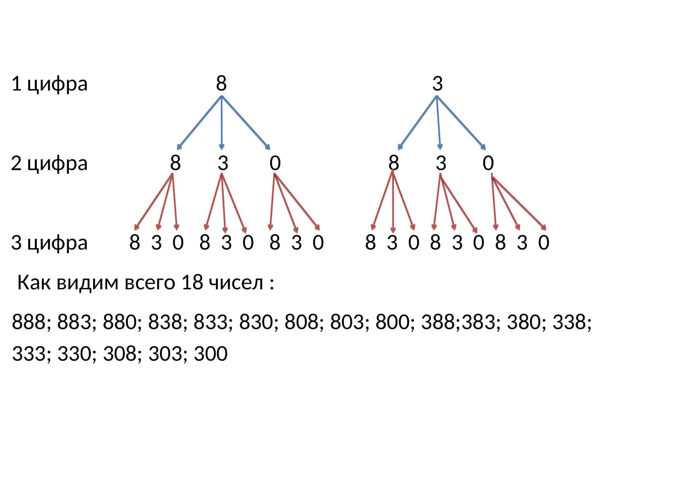 Запишите все трёхзначные числа, для записи которых используются только цифры 0, 8 и 3 (цифры могут повторяться).