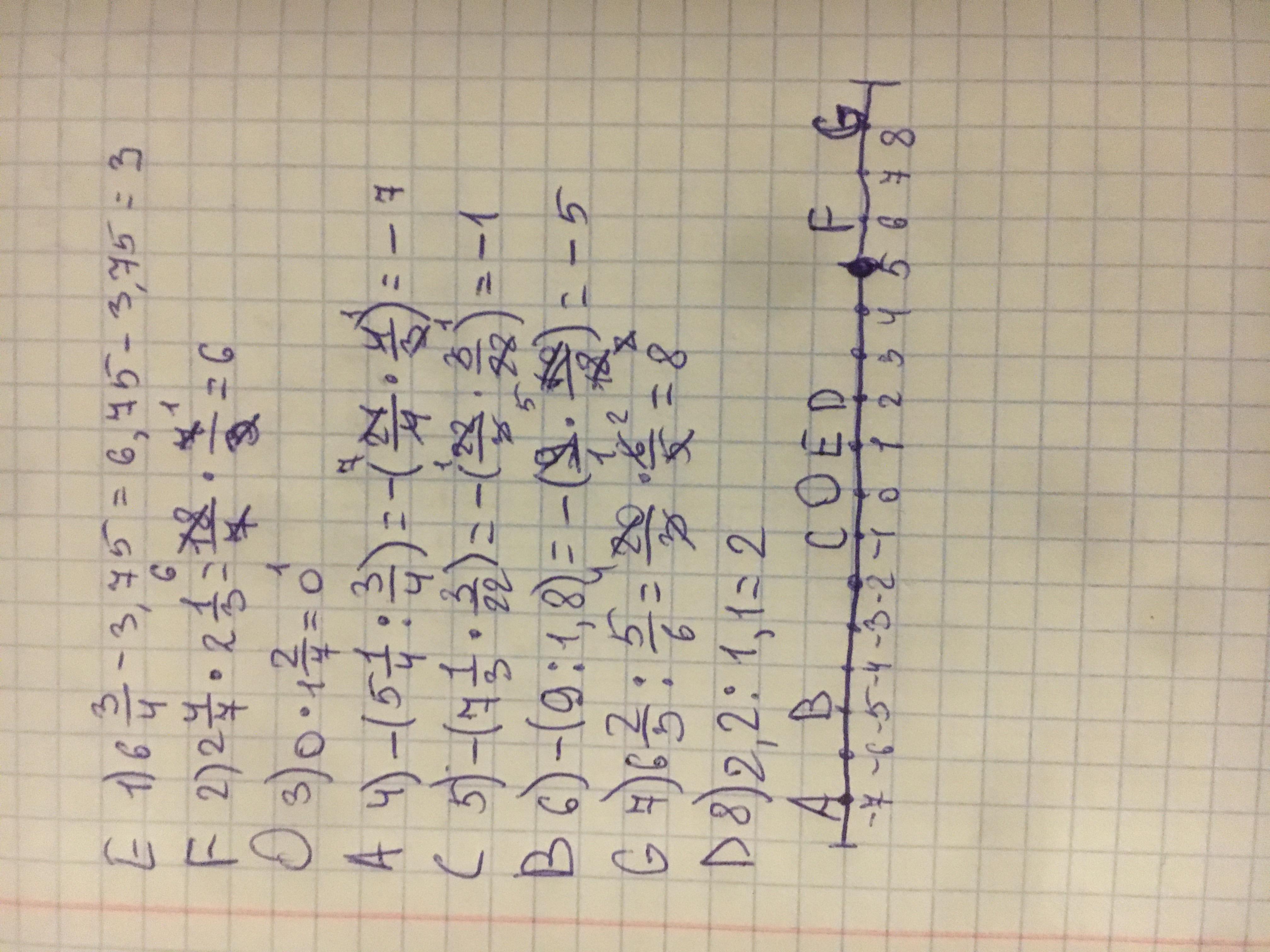 Плиз! На координатной прямой отметьте точки, координаты которых соответствуют значениям выражениё: 1) 6 3/4-3,75; 2) 2 4/7 * 2 1/3 ; 3) 0* 1 2/7; 4) -(5 1/4 : 3/4; 5) -( 7 1/3 * 3/22) ; 6) -( 9 : 1,8 ) ; 7) 6 2/3 : 5/6 ; 8) 2,2: 1,1