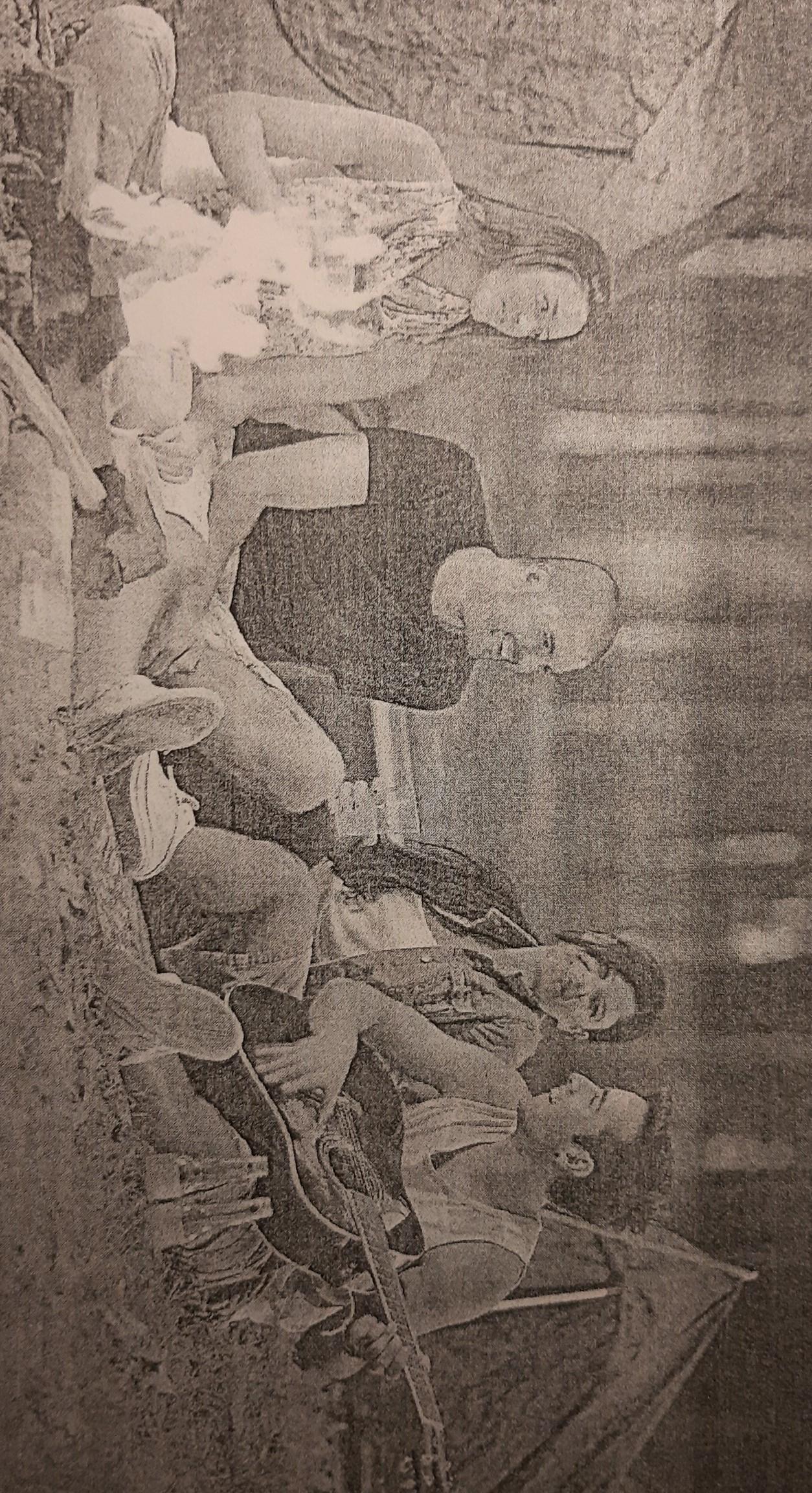 Небольшая компания из 4-ех человек устроили привал. Один из них играет на гитаре, другие разговаривают и развлекаются