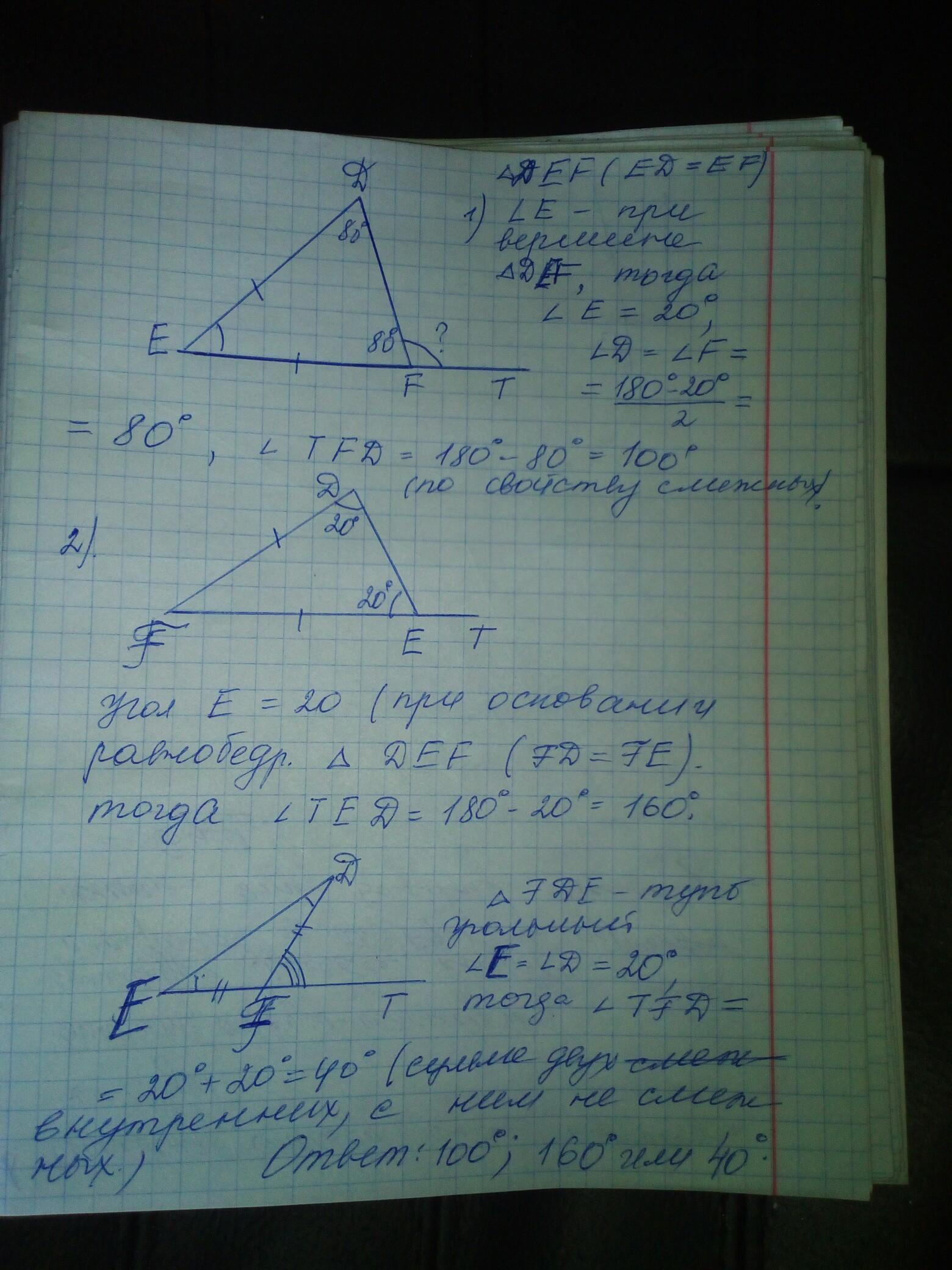 В равнобедренном треугольнике DEF известно, что ∠E=20°. Найди величину внешнего угла при вершине F.