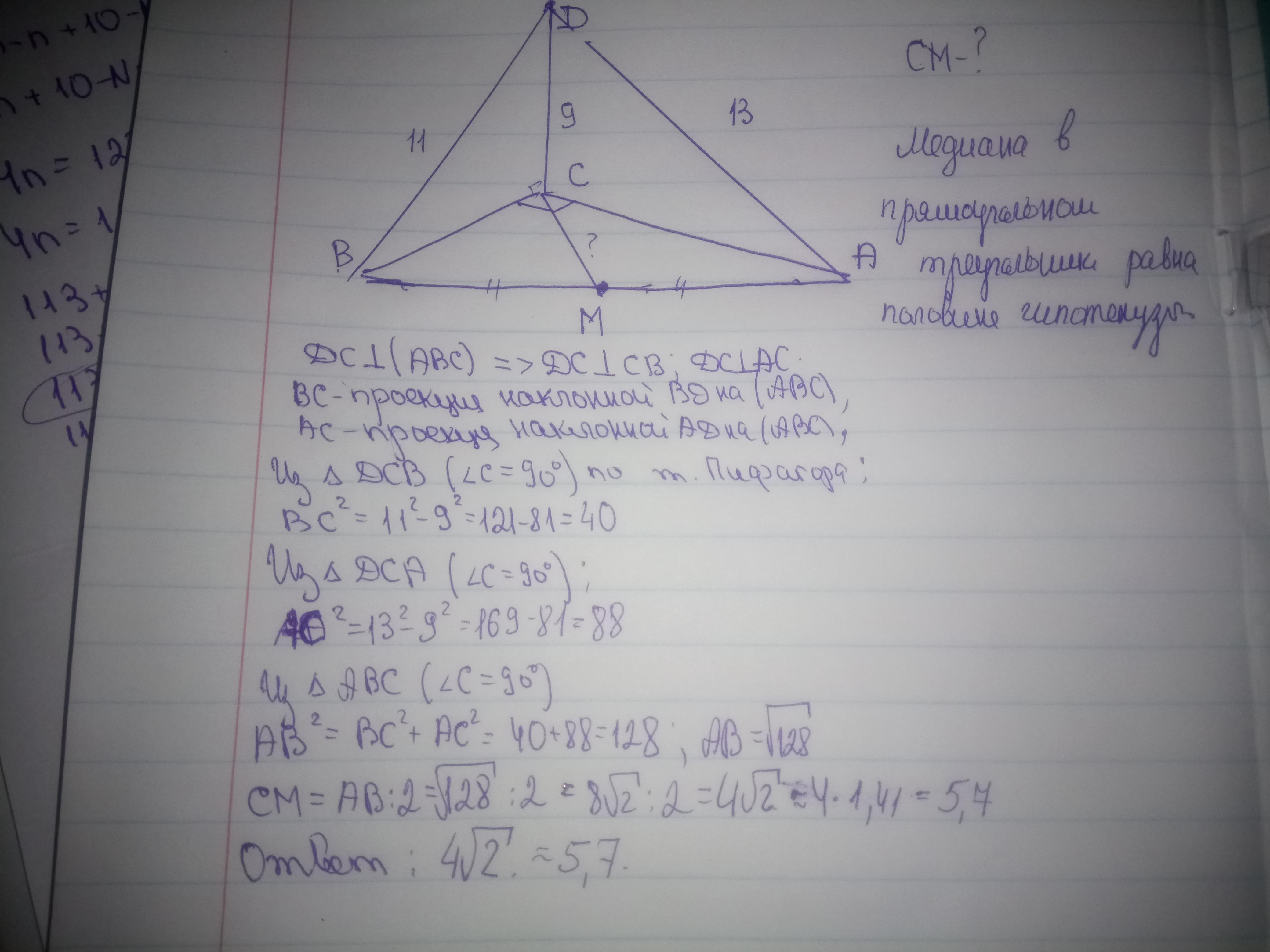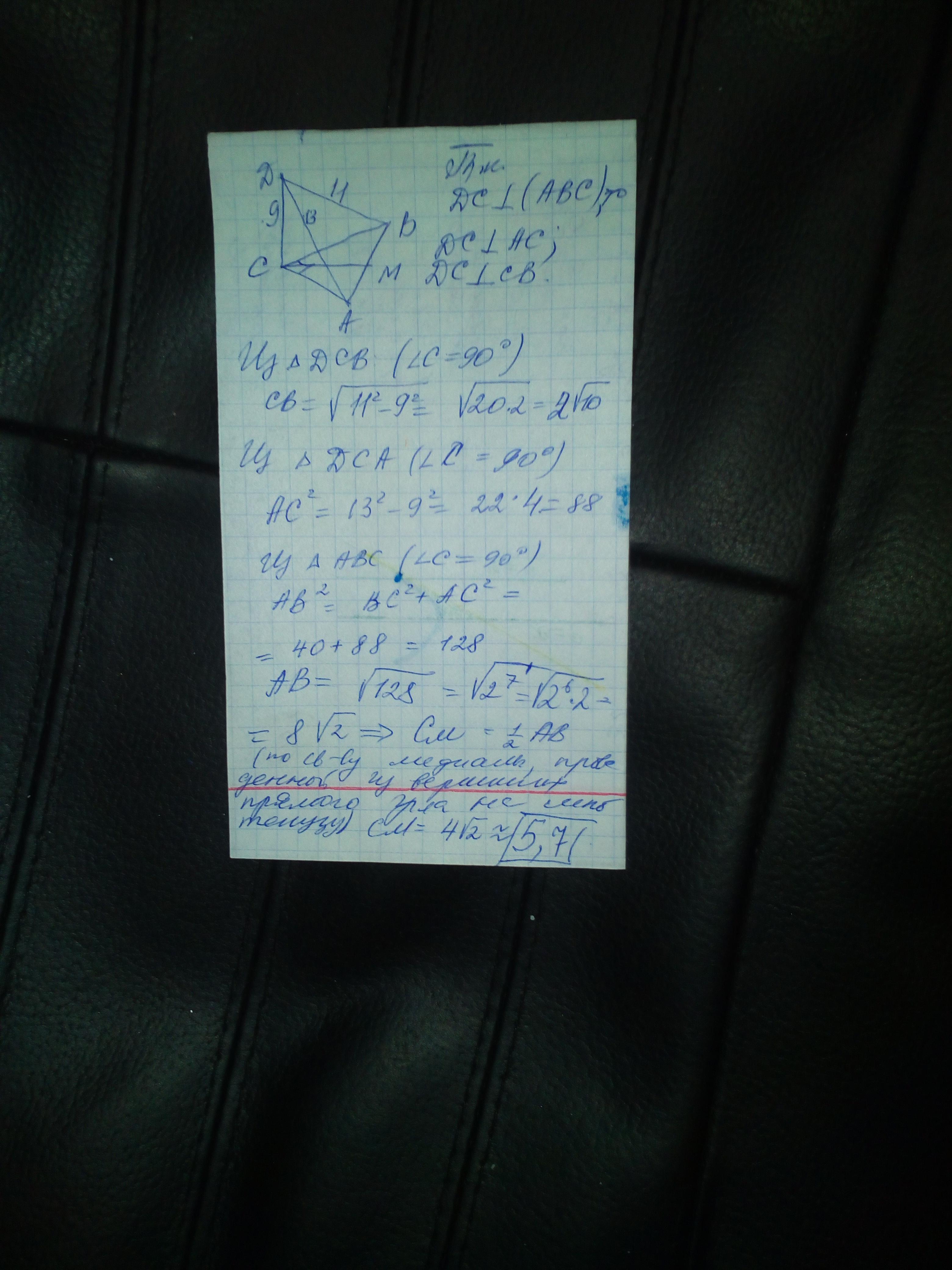 Через вершину C прямого угла ABC проведено прямую CD, перпендикулярную его плоскости, AD=13, BD=11, CD=9. Найдите медиану CM треугольника ABC. Ответ округлите до десятых.